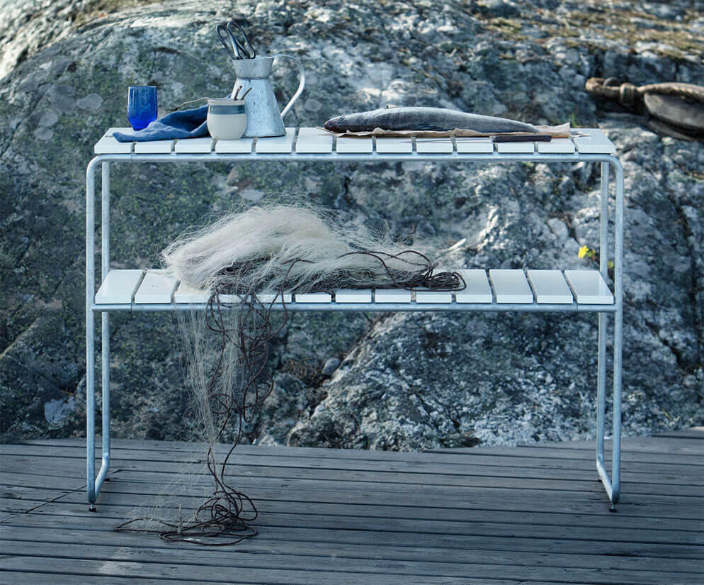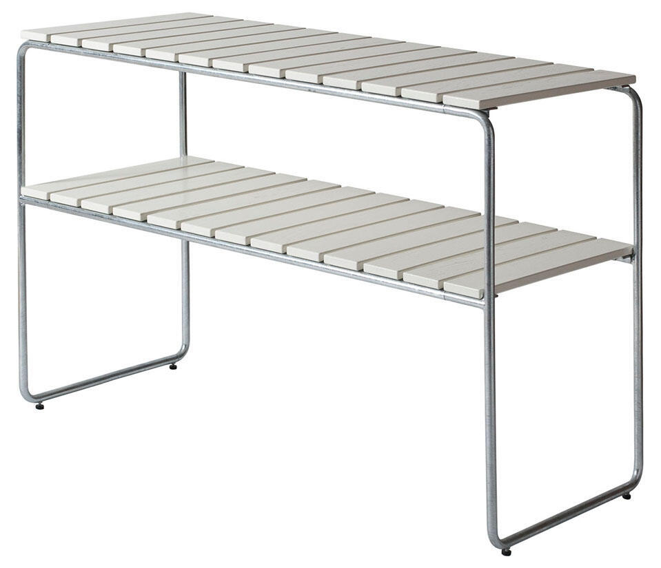 Avlastningsbord L105 är ett stilrent sidobord från Grythyttan Stålmöbler som passar in i de flesta utemiljöer. Ingår i Klassikerserien så du kan enkelt kombinera med andra möbler ur serien. De två planen gör bordet extra användbart. L105 är designad av Maria Håård och Jan-Olof Ågren och finns i tre utföranden; oljad ek, obehandlad teak och vitlackad ek. Alla med varmförzinkat stålunderrede.