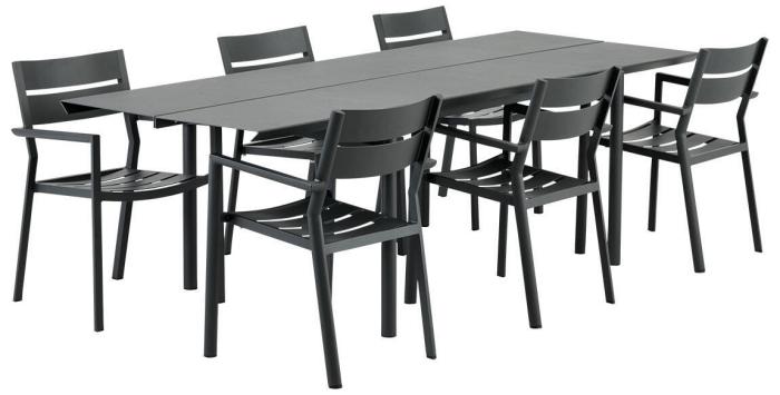B45 matbord 250x92 cm tillsammans med sex alternativt åtta karmstolar Delia är en färdigkomponerad matgrupp för din uteplats. I paketet ingår ett matbord i färg antracit och sex/åtta stapelbara stolar i färg dusty green.