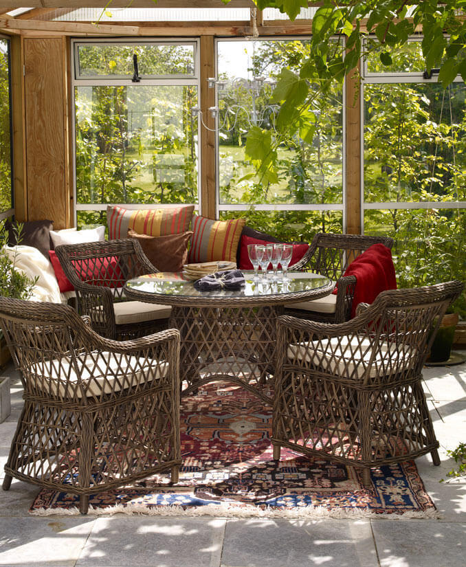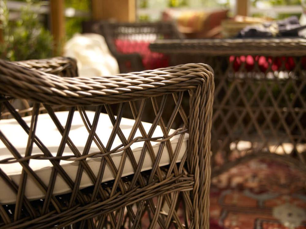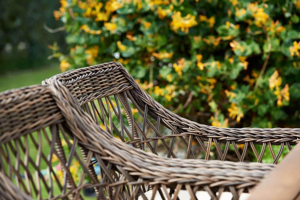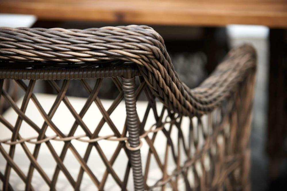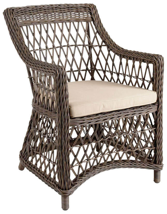 Beatrice karmstol har tydliga och karakteristiska influenser från förr, med glesflätad 5,3 mm konstrotting på stomme av aluminium. Välj konstrotting i brun eller vit, dyna i beige olefintyg ingår.