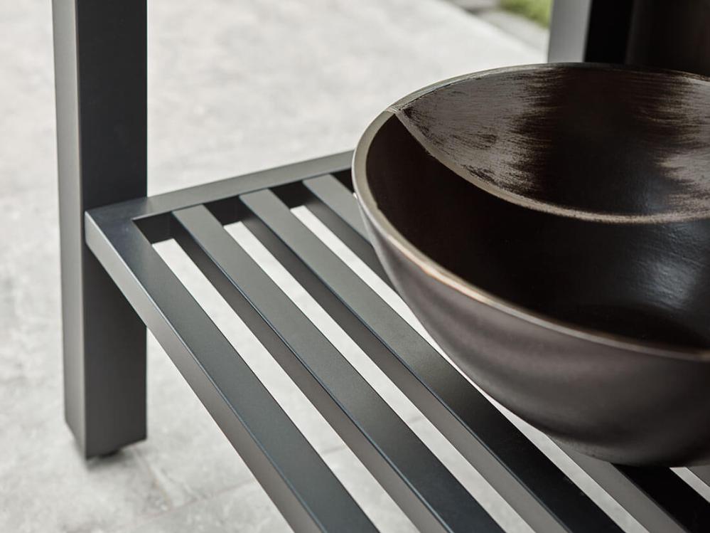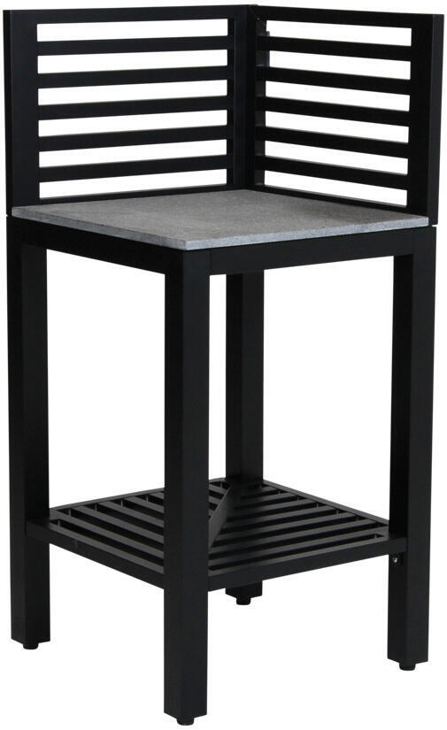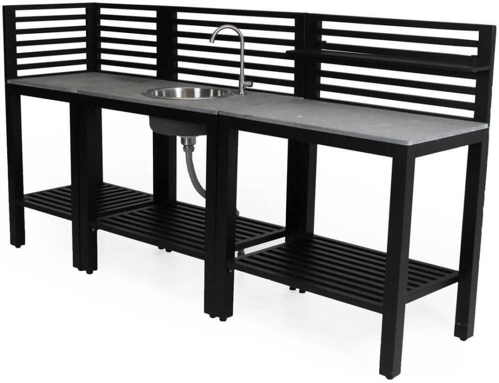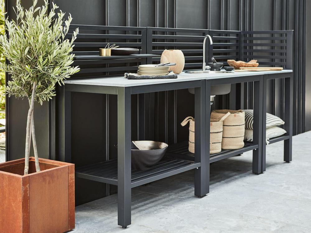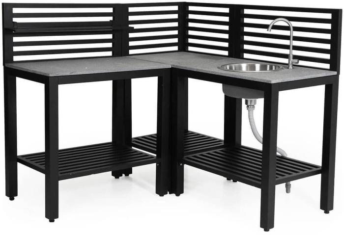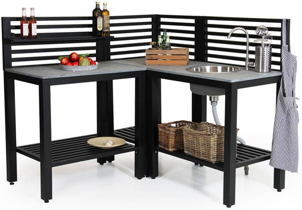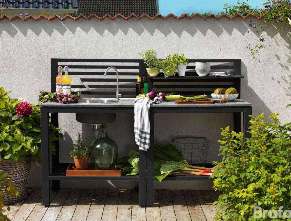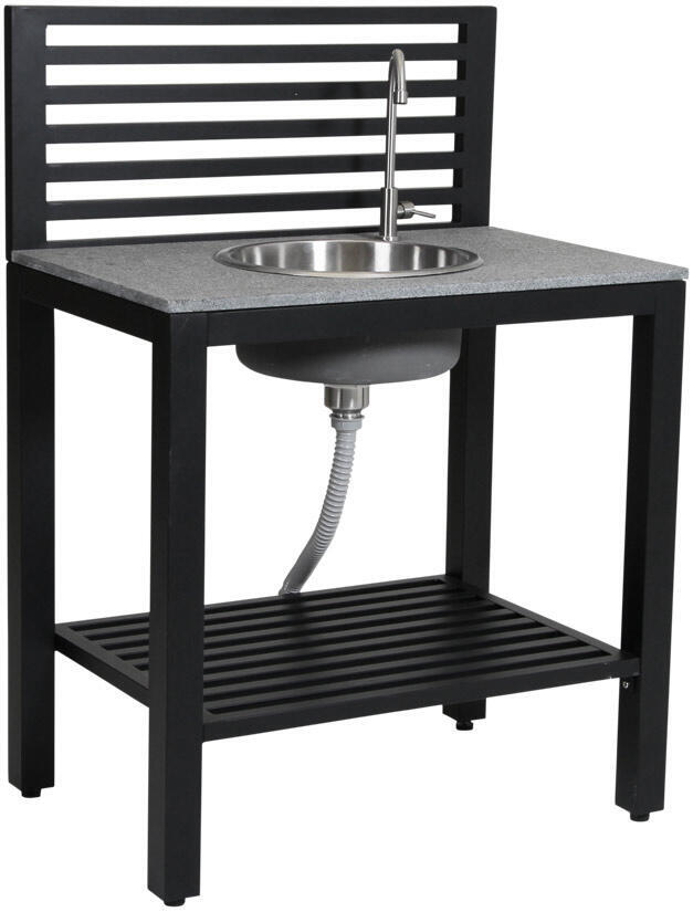 Bellac utekök är en komplett serie möbler som ger plats för trädgårdsarbete eller för dig och dina vänner att tillsammans tillaga och förbereda dagens måltid, under bar himmel! Det flexibla uteköket från Brafab har en stilren och modern utformning, serien består av tre delar; en sektion med vask och kran av rostfritt stål, en mittsektion med ett hyllplan (fler kan köpas till) och slutligen en hörndel som kan användas både som ett hörn men även som ett elegant och ombonat avslut. Alla moduler är tillverkade av tåliga material vilket gör att köket kan stå utomhus året runt, stomme av matt svart eller vit pulverlackad aluminium med toppskiva av grå granit.