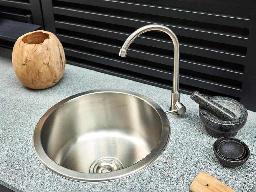 Den här kombinationen av Bellac utekök består av 1st mittsektion med ett hyllplan, 1st sektion med vask och kran och 1st hörnmodul. Modulerna kan placeras var för sig men sätts med fördel samman till ett hörnkök alternativt ett på rad med hörndelen som ett stilrent avslut. Fler delar kan köpas till för att skapa ett större kök.