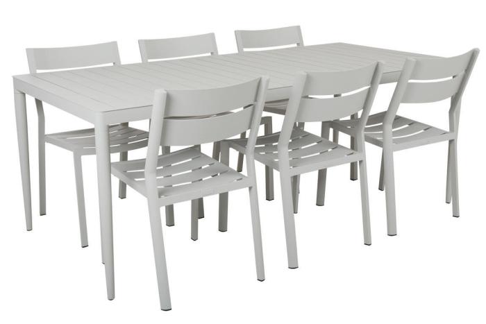 Här har du en elegant och funktionell utomhusmatgrupp bestående av ett Bigby 195x90 cm rektangulärt matbord och sex Delia matstolar från Brafab.