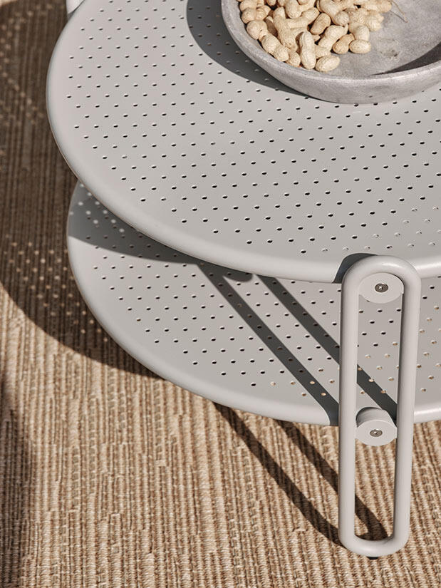 Den mattsvarta stommen kombineras med mörkgrå textilene och tjocka och mjuka dynor klädda i olefintyg med vattenavvisande beläggning - medan den ljusgråa stommen har textilene i offwhite och dynor klädda i ett bouclé-inspirerande tyg av återvunnen polyester.