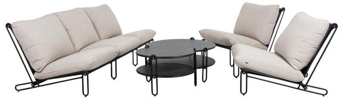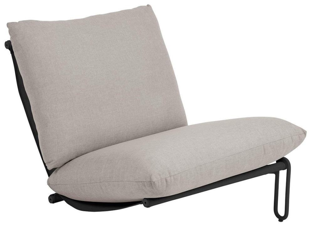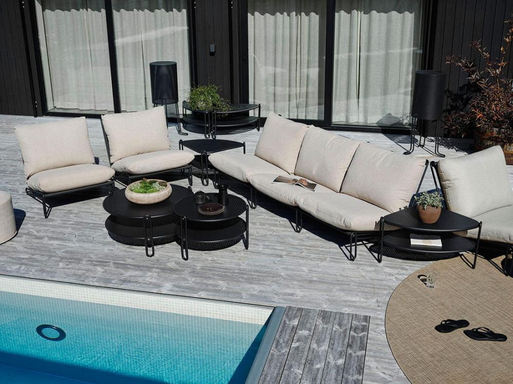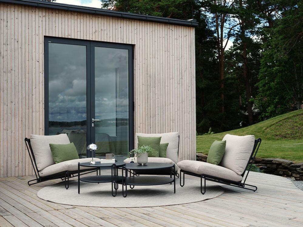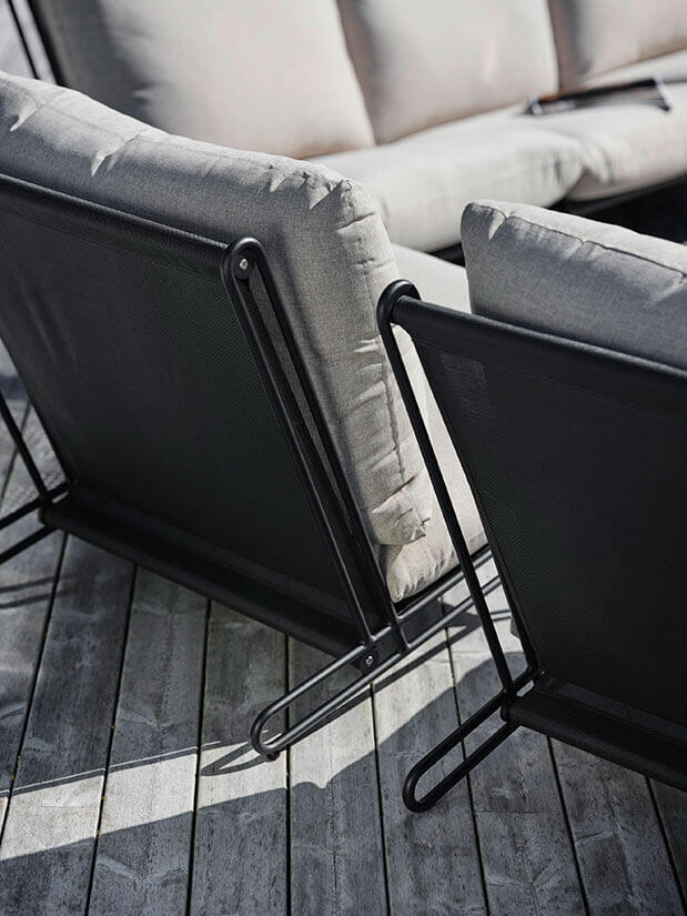 Den mattsvarta stommen kombineras med mörkgrå textilene och tjocka och mjuka dynor klädda i olefintyg med vattenavvisande beläggning - medan den ljusgråa stommen har textilene i offwhite och dynor klädda i ett bouclé-inspirerande tyg av återvunnen polyester.