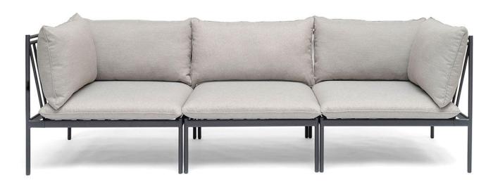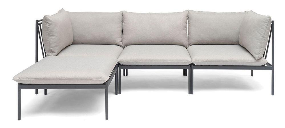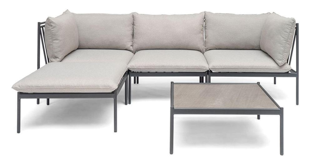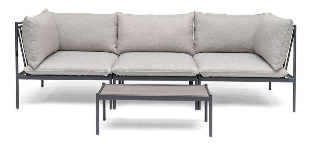 Kollektionen består av en hörndel, mittdel, divan/pall och bord i två storlekar. Soffan är tillverkad i aluminium med dynor i gråbeige olefin. Borden har ben och ram i aluminium med varmgrå keramisk glasskiva, 5mm. Klädseln på dynorna är avtagbar och kan tvättas i handtvätt 30 grader. Diskreta beslag och sammansättningar. Klämma medföljer för låsning av moduler. Bygg som du vill och flytta runt modulerna efter behov.