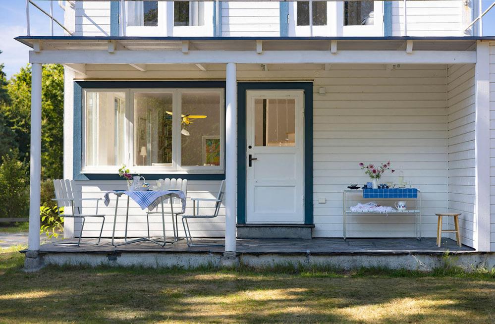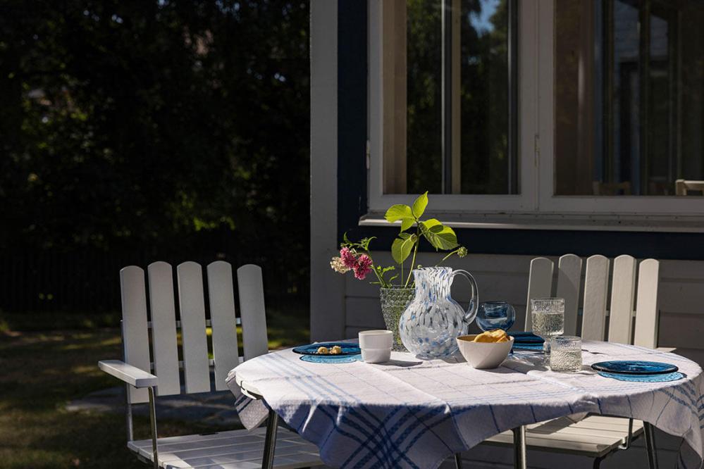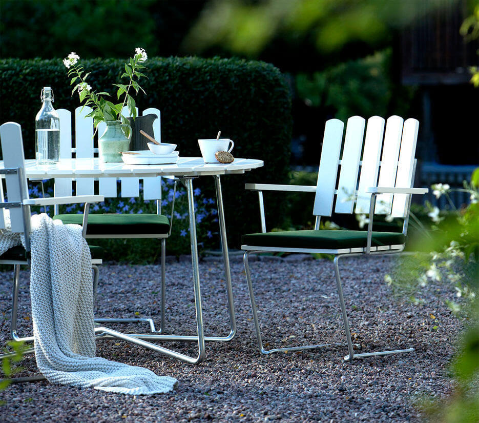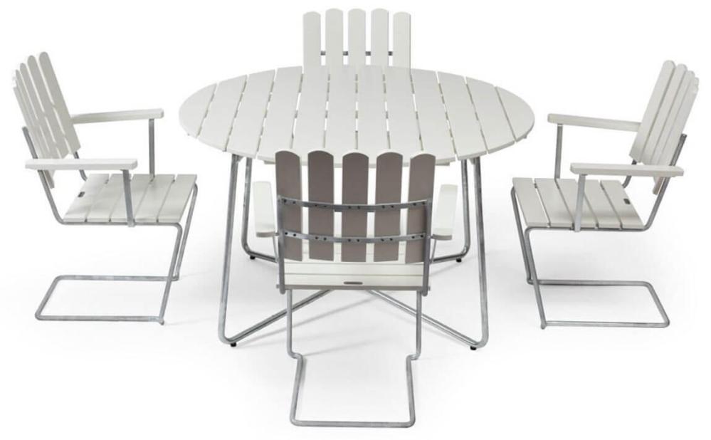 Matgrupp till uteplatsen bestående av det klassiska runda matbordet 9A i storlek 100 cm med fyra stycken fåtölj A2 från Grythyttan Stålmöbler. Bordet tillsammans med de skönt gungande stolarna är den perfekta trädgårdsgruppen för alla tillfällen.