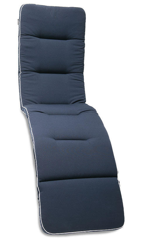 Däckstolsdyna 74 är 8 cm tjock och passar bäst till en solsäng av trä. Dynan har en klädsel i dralon. Färg: blå med vit kant.
