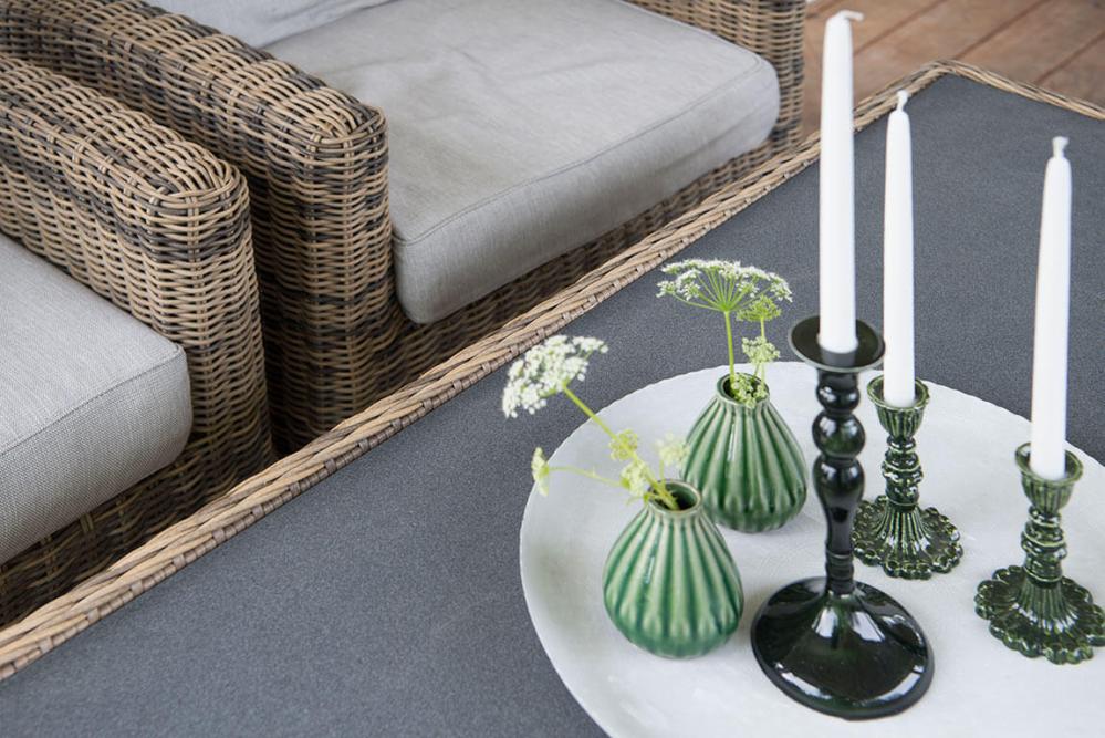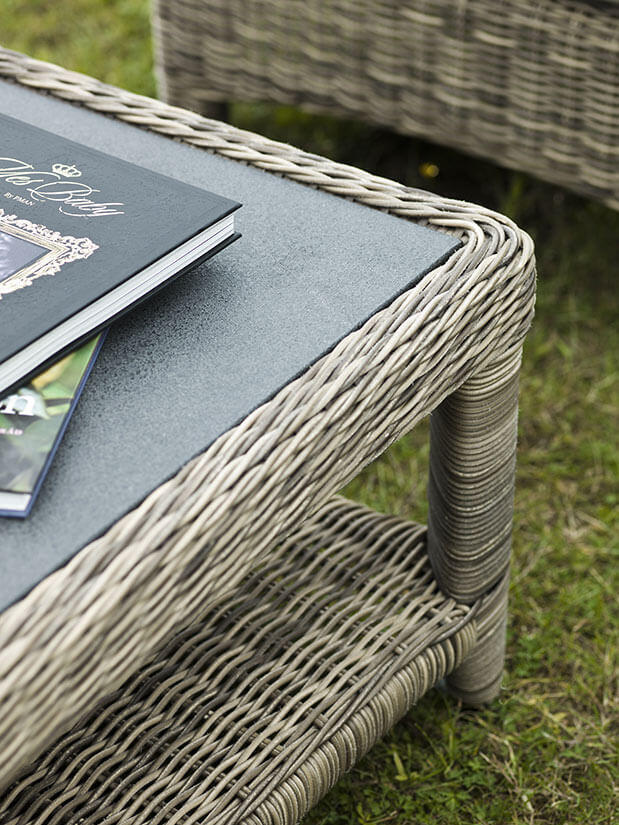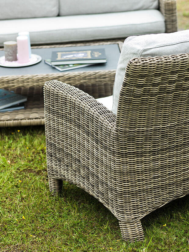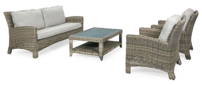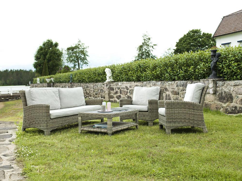 Dallas loungegrupp bestående av en 2,5-sitssoffa, två fåtöljer och ett soffbord skapar tillsammans en inbjudande och ståtlig utegrupp. Möbler i naturfärgad konstrottingstråd med cirkelrund profil. Det ger en omisskännlig karaktär åt trädgårdsgruppen och konstruktionen tillhör de mest exklusiva på marknaden.