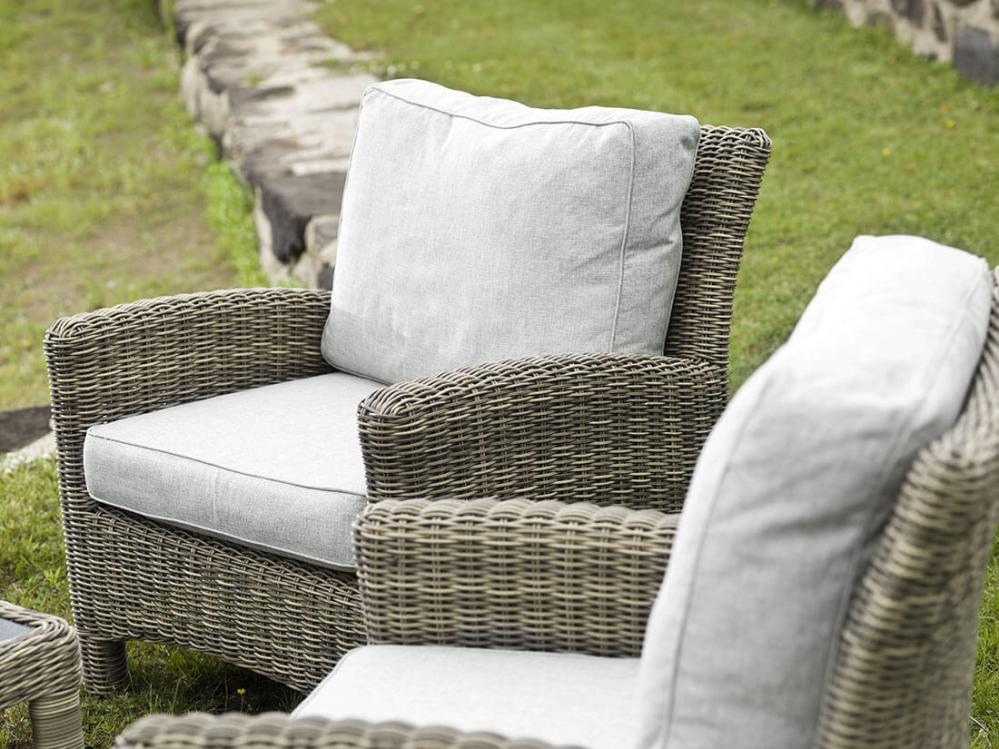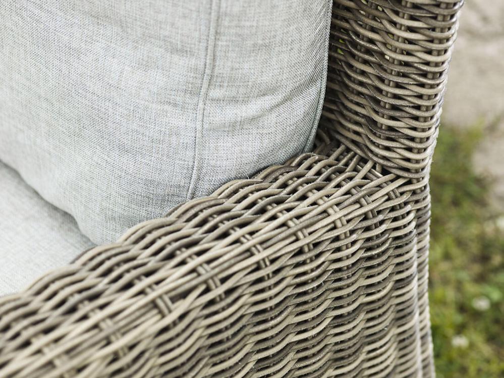 Konstrotting av Quató™-fiber flätad kring en stomme av aluminium borgar ytterligare för hög kvalitet. Tjocka och sköna dynor i beigegrå polyester köps som tillval.