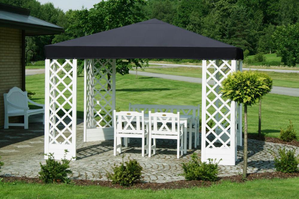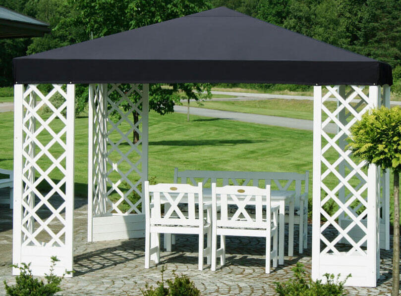 Paviljongtak 350x350 cm i kraftig polyester till paviljong De Luxe från Hillerstorp. Taket fästes med kardborreband, upptill sitter 2 st öljetter på vardera sida för vattenavrinning för att undvika vattensamlingar. Taket De Luxe finns i tre färger; blå, svart och vit.