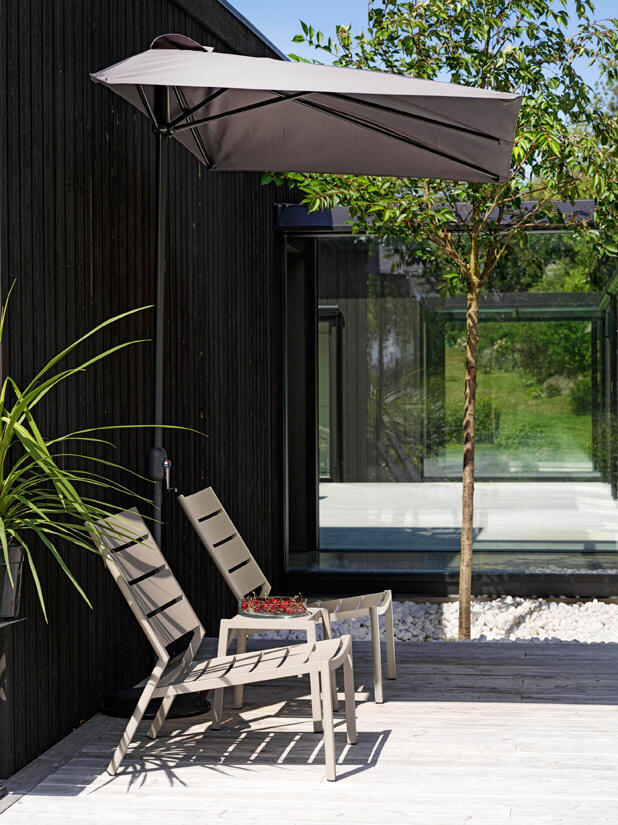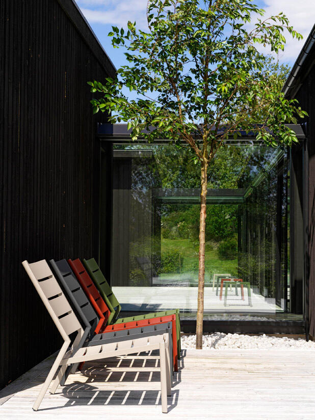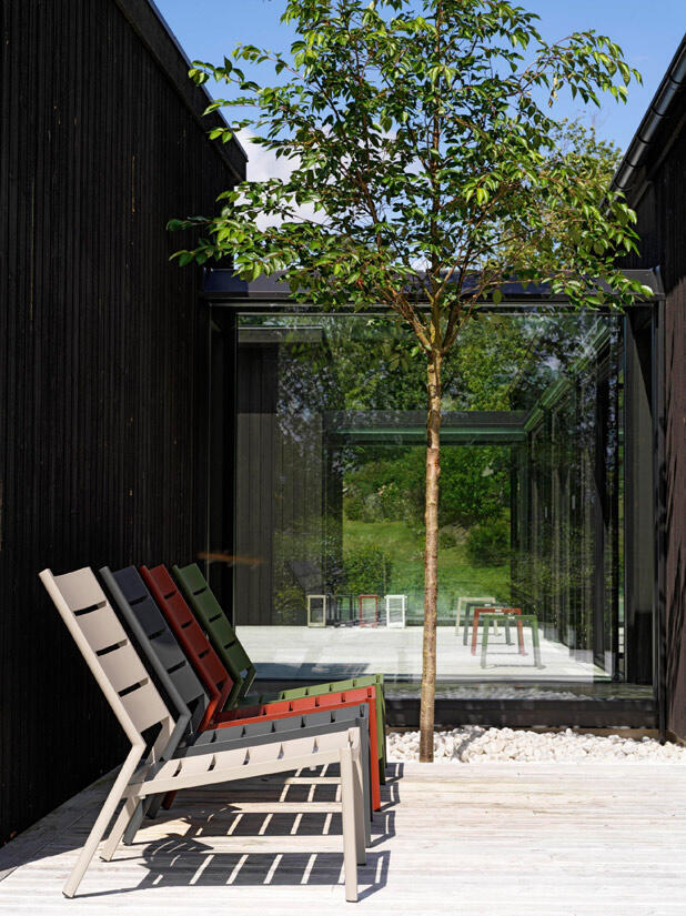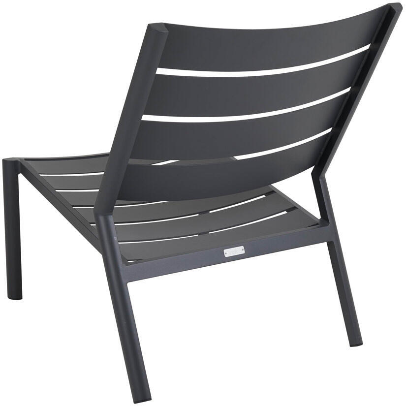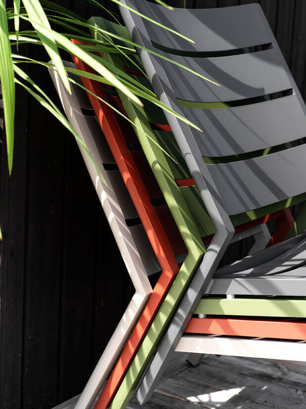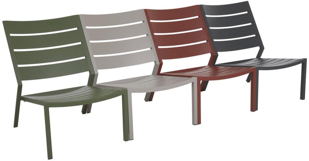 Delia är en modern kollektion trädgårdsmöbler från Brafab. En del av serien är den här loungefåtöljen helt tillverkad av mattlackad aluminium. Relaxstolen finns i färgerna antracitgrå, beige (khaki), grön (moss green och dusty green) och röd (burnt paprika). Modellen går bra att stapla för smidig förvaring.