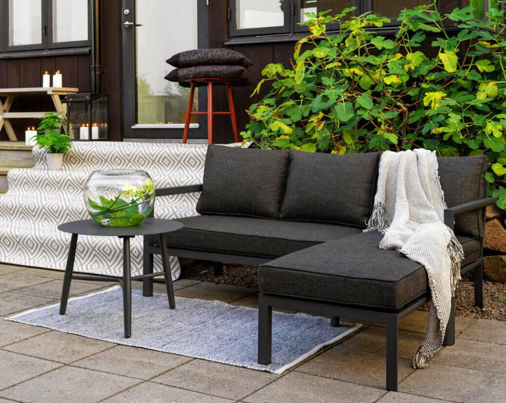 Soffan Delia har ett modernt formspråk med snyggt utformade detaljer på ben och stomme, med utmärkt sittkomfort. I serien hittar du en rad andra möbler till uteplatsen, du hittar dem alla en bit ner på sidan under Liknande produkter. Där hittar du även den matchande produktserien Nimes från Brafab med flera storlekar av matbord.