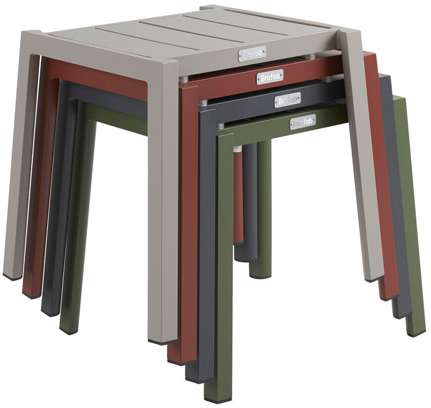Delia är en modern kollektion trädgårdsmöbler från Brafab. En del av serien är det här nätta och praktiska sidobordet. Bordet är tillverkat av mattlackad aluminium i färgerna antracitgrå, grön (moss green och dusty green), röd (burnt paprika) och khaki.