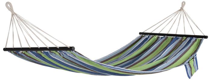 Dvala hängmatta i blå- och grönrandigt bomullstyg. En traditionell hängmatta i kraftig bomull med nackkudde och praktisk sidoficka. Hängmattan har många upphängningssnören vilket bidrar till komfort och lång livslängd. Fler snören fördelar vikten jämnare, vilket ger en känsla av viktlöshet. Komplettera gärna med upphängningsband Veranda eller valfritt hängmattestativ (säljes separat).