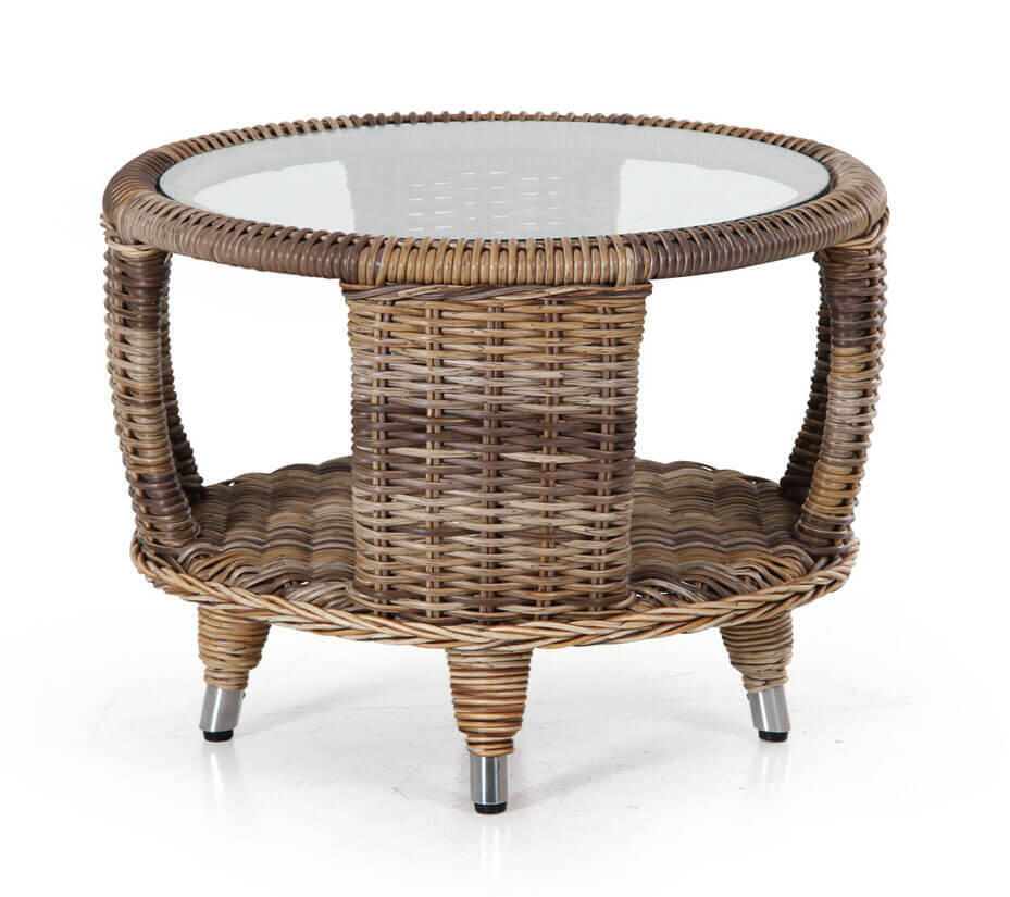 Evita är ett runt sidobord med en brunmelerad flätning av 5,3 mm halvrund konstrotting på aluminiumstomme med glasskiva.