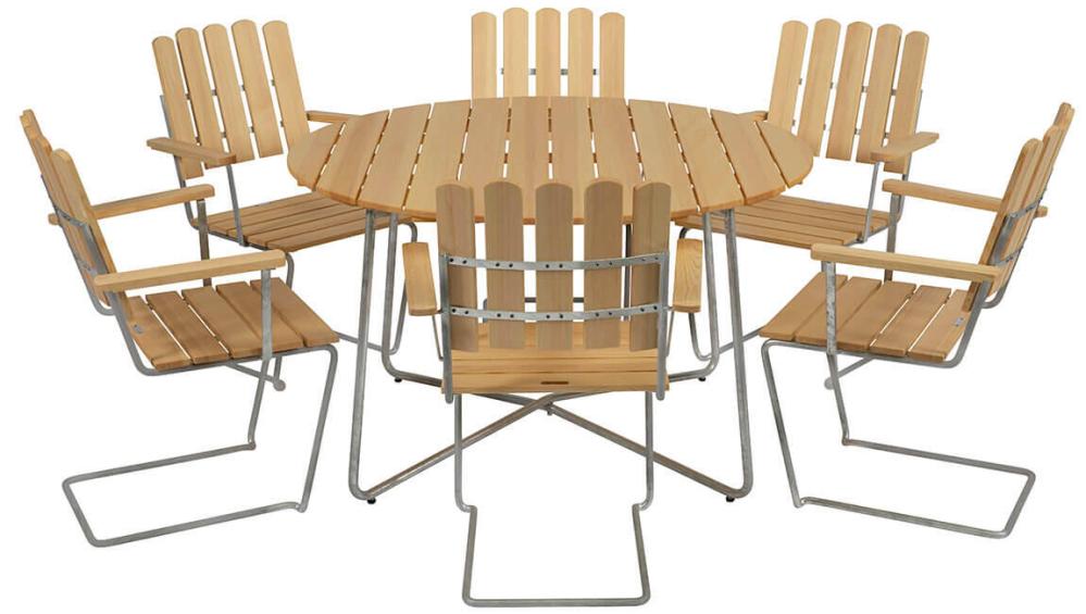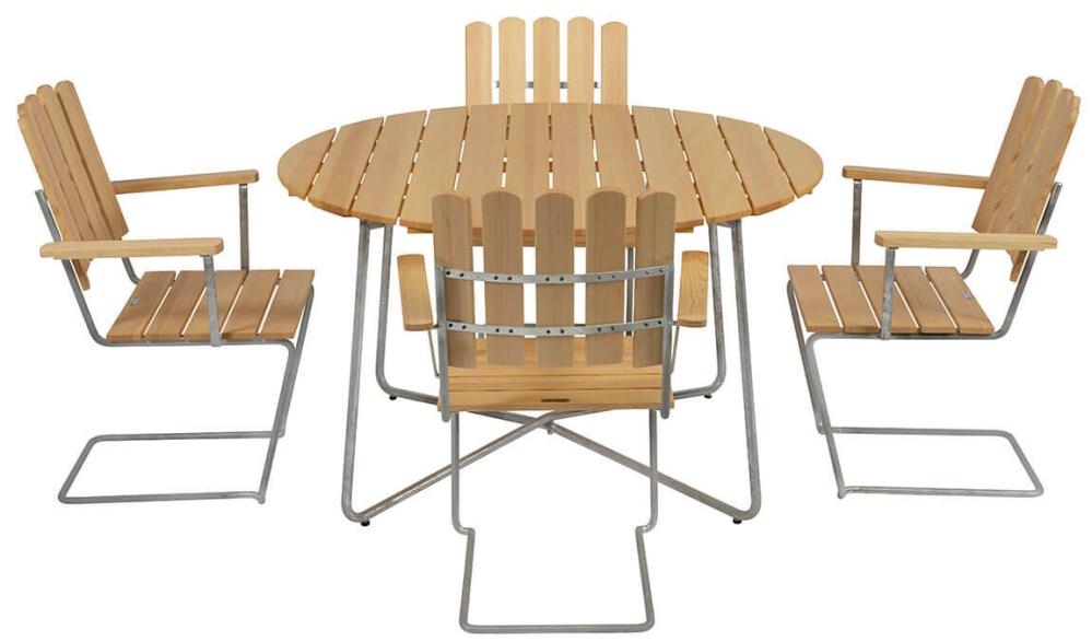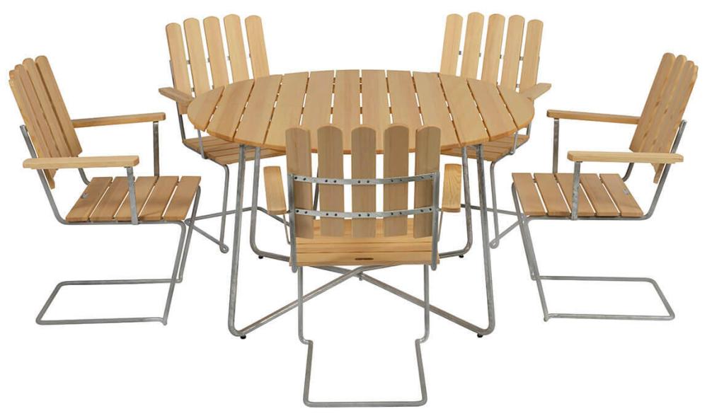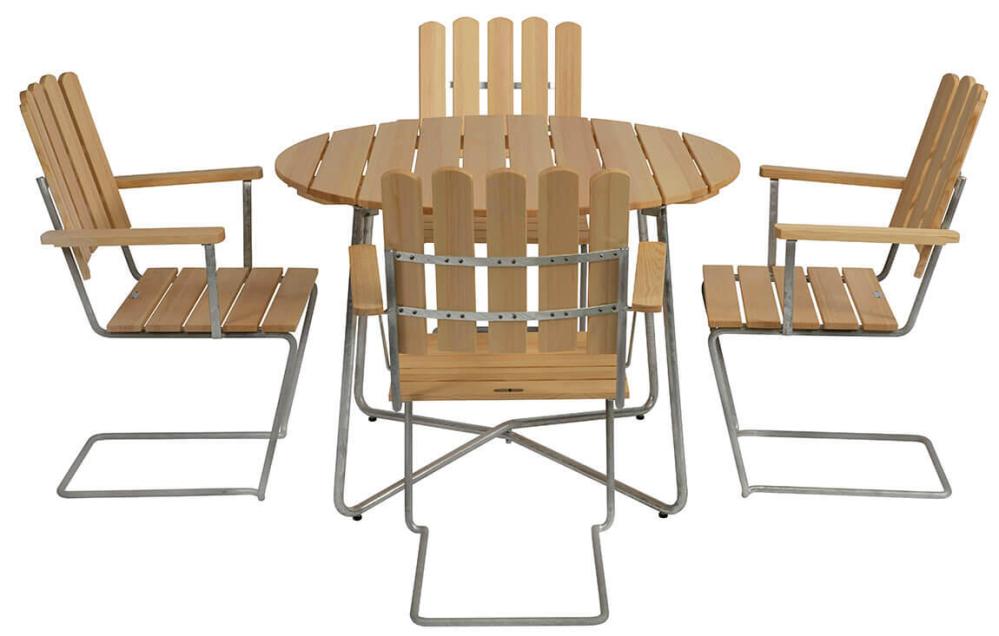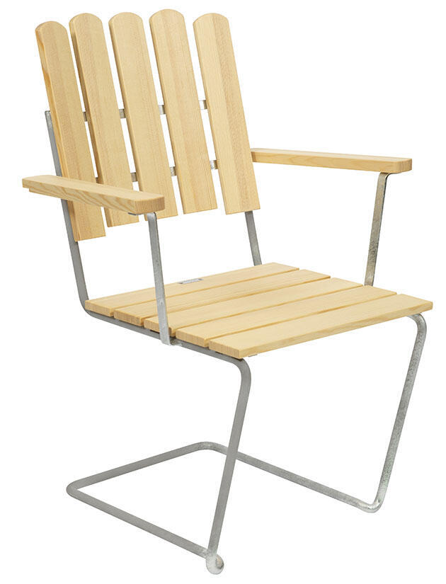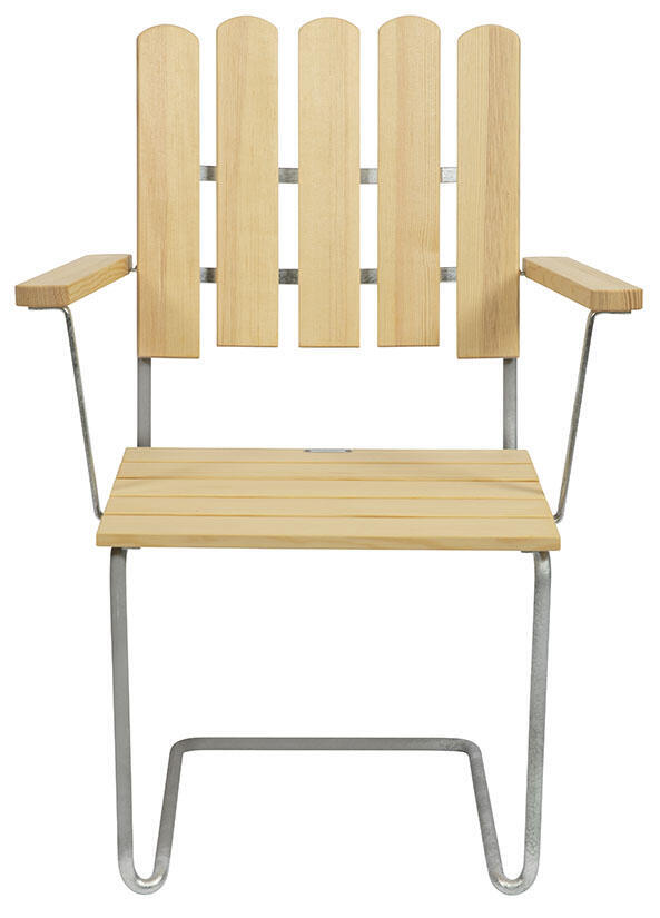 Fåtölj A2 är trotjänaren och kanske det som mest förknippas med Grythyttan Stålmöbler. Designades till Stockholmsutställningen år 1930 av Artur Lindqvist. Karmstolen har funnits i bersåer, på utomhusserveringar och i trädgårdar sedan dess. Stativet i massivt fjäderstål ger lång livslängd och den rogivande, välkända svikten. En möjlig förklaring till att fåtöljen fortsatt är omåttligt populär efter flera decennier kan vara kombinationen av den stilrena designen och den höga kvalitén. Fåtöljen A2 finns i flera utföranden och har en design som gör den stapelbar, perfekta lösningen för den mindre uteplatsen eller caféet. Gör stolen både tystare och lättare att flytta på hårt underlag genom de smidiga golvskydden som finns som tillbehör. Stolen ingår i Klassikerserien från Grythyttan Stålmöbler som innehåller flera sittmöbler, bord och komplement till trädgården.