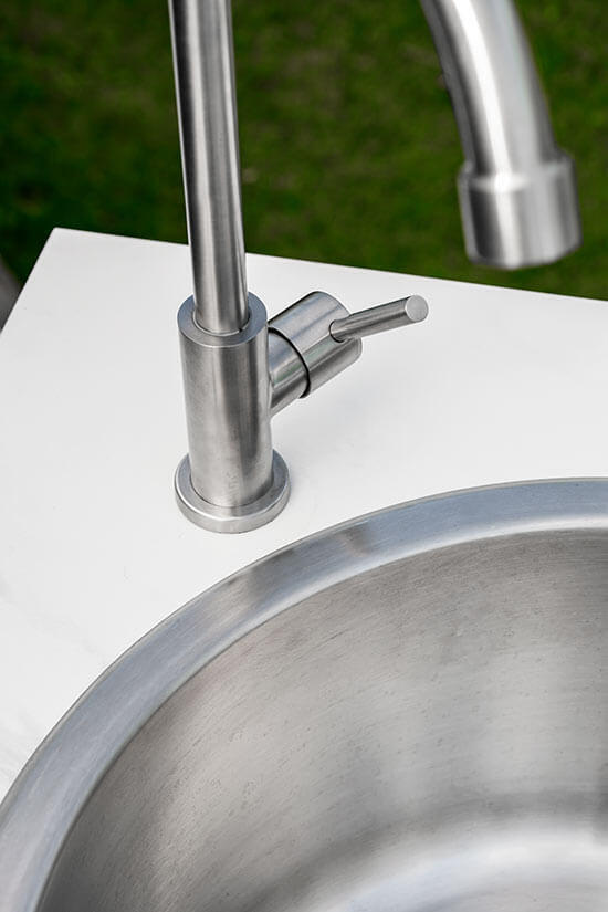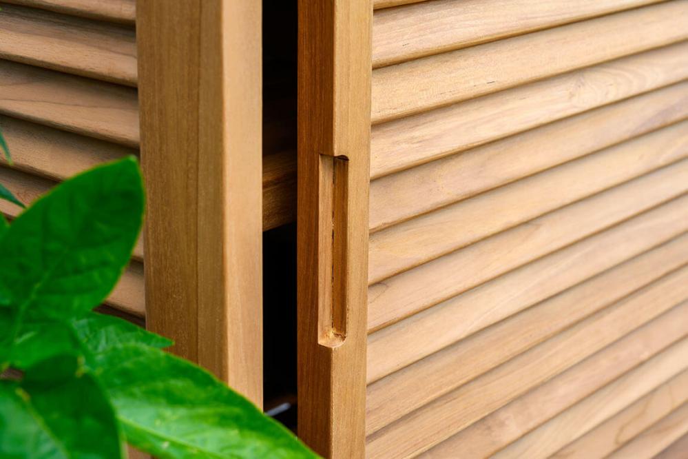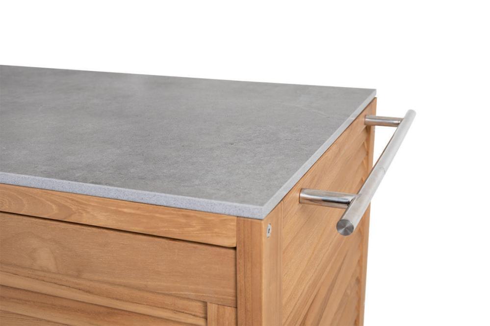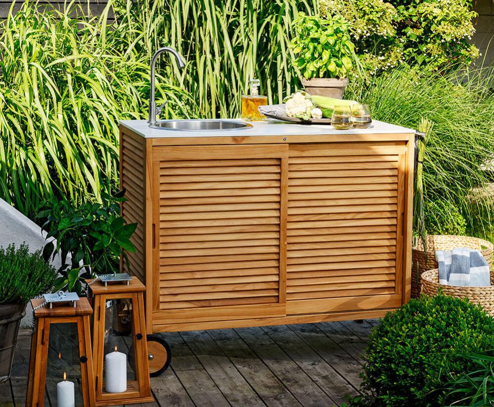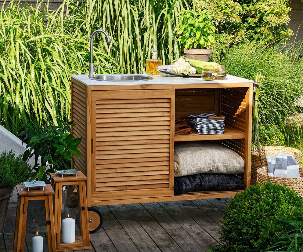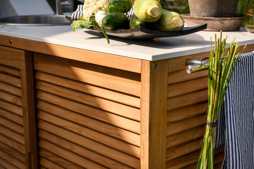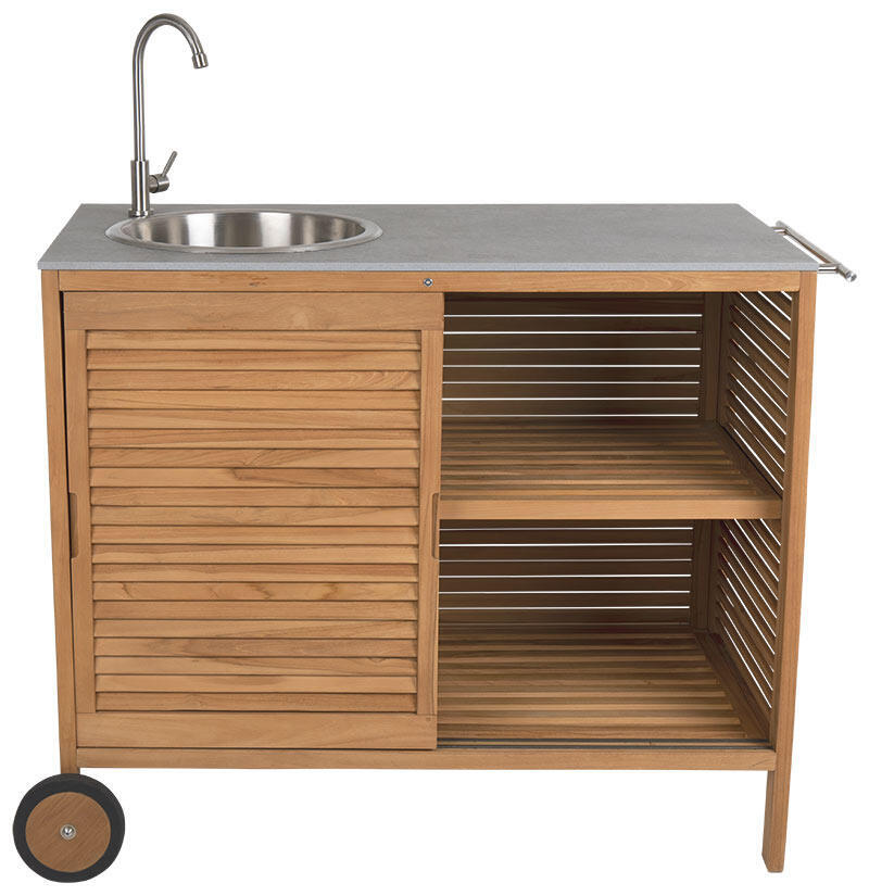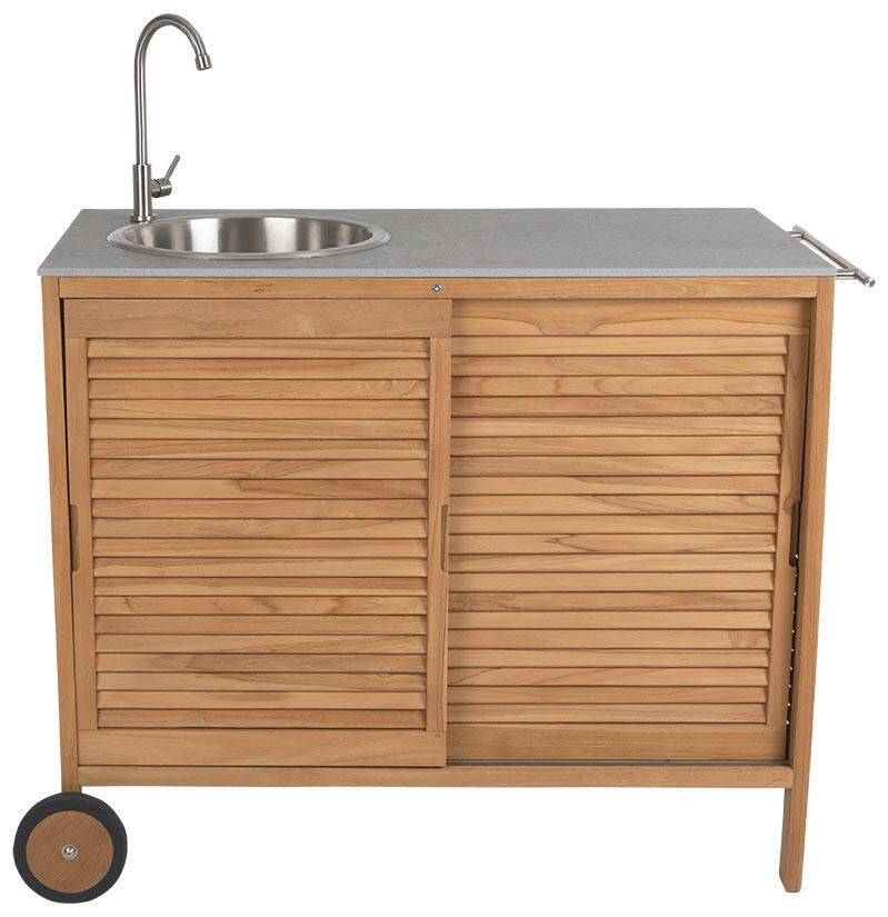 Figalia är ett tidlöst och portabelt utekök i vacker teak med topp i stenkomposit med rejäl arbetsyta, rostfri vask och kran samt stora hjul. Bakom eleganta ribbade skjutdörrar döljer sig praktisk förvaring och på sidorna finns handtag för grillredskap eller andra saker man gärna vill ha nära till hands. Figalia utekök finns med två olika toppar; grå betonglook eller vit marmorlook.