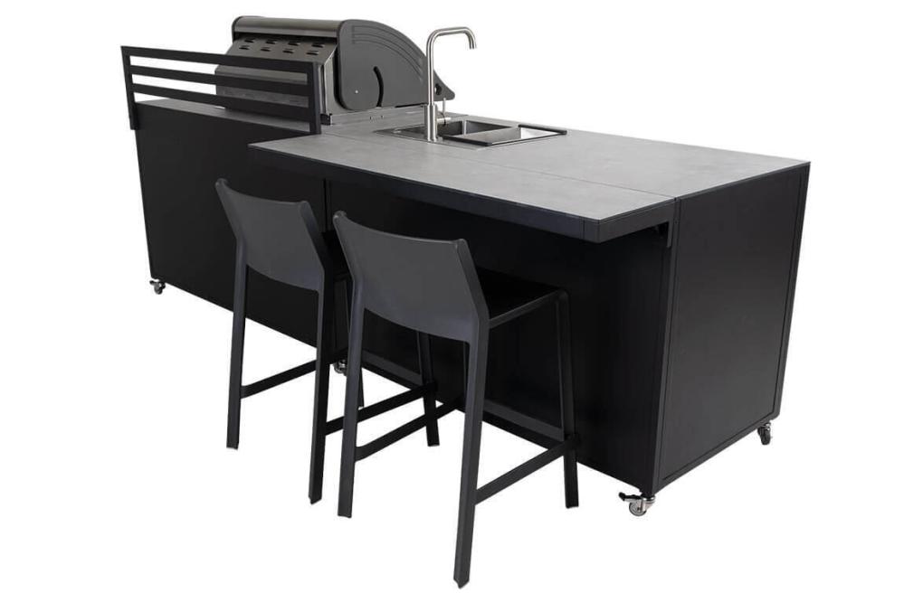 En enhet är förberedd för att lägga till en gasolgrill (OBS! köps separat), en enhet har diskho och vattenkran och en annan enhet har en slät topp, perfekt som arbetsyta. Alla enheter har rejäla hjul, bakdel/staket och hylla. Som tillbehör finns också en skiva (stor och liten) som kan monteras för att skapa en bardisk.