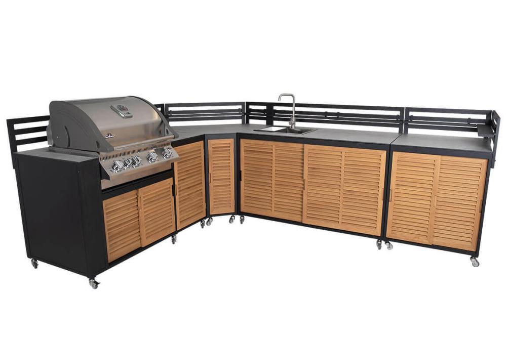 En enhet är förberedd för att lägga till en gasolgrill (OBS! köps separat), en enhet har diskho och vattenkran och en annan enhet har en slät topp, perfekt som arbetsyta. Alla enheter har rejäla hjul, bakdel/staket och hylla. Som tillbehör finns också en skiva (stor och liten) som kan monteras för att skapa en bardisk.
