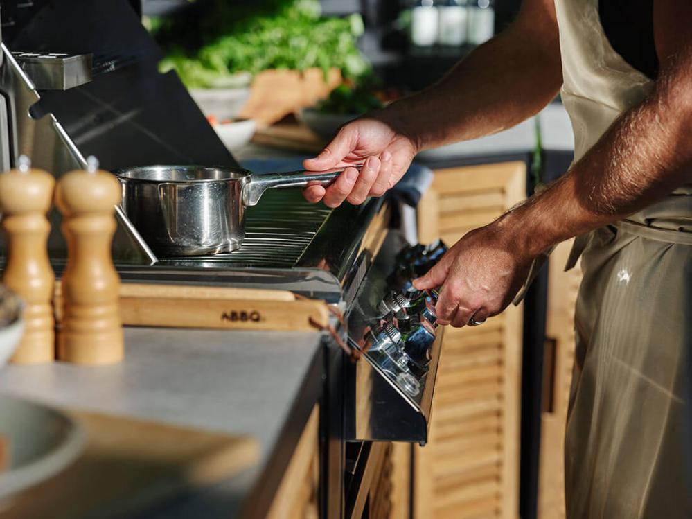 Delen som är förberedd för en gasolgrill har mått för att passa t.ex. Napoleon BILEX485-1, gasolgrillen köps separat. Bilderna med grillen monterad är enbart för visningssyfte.
