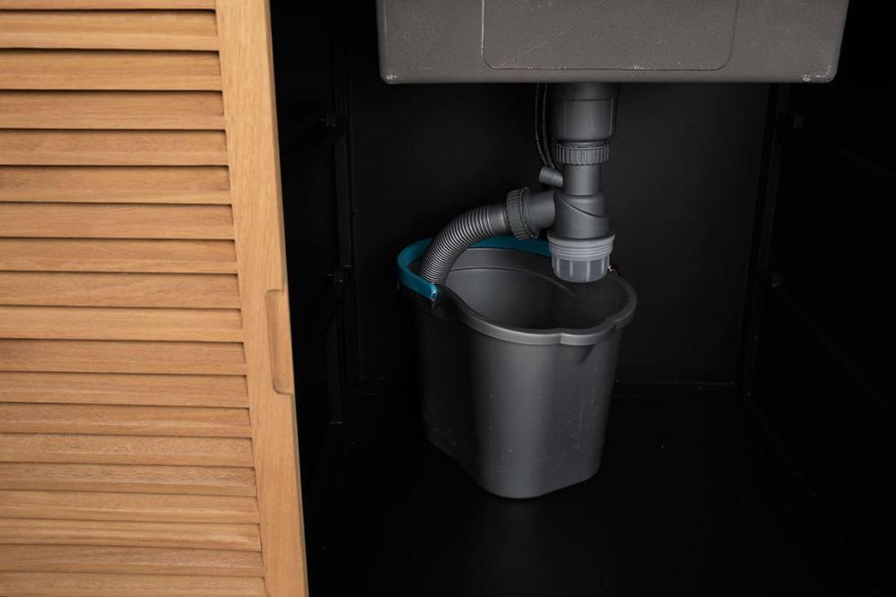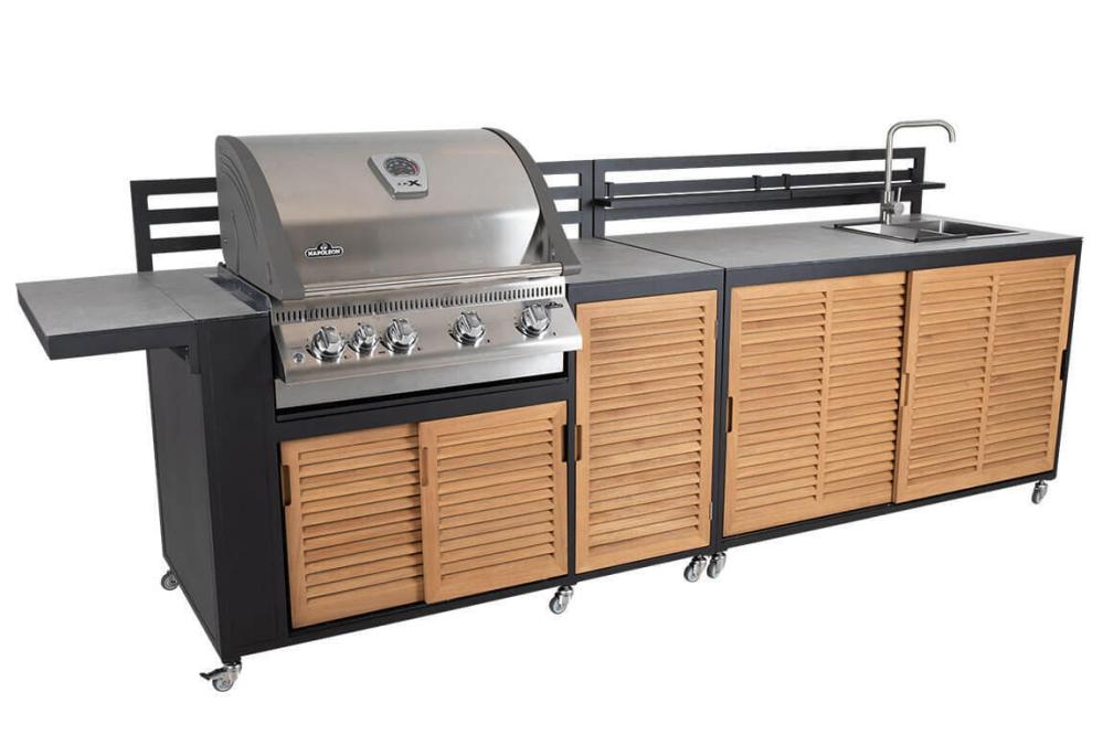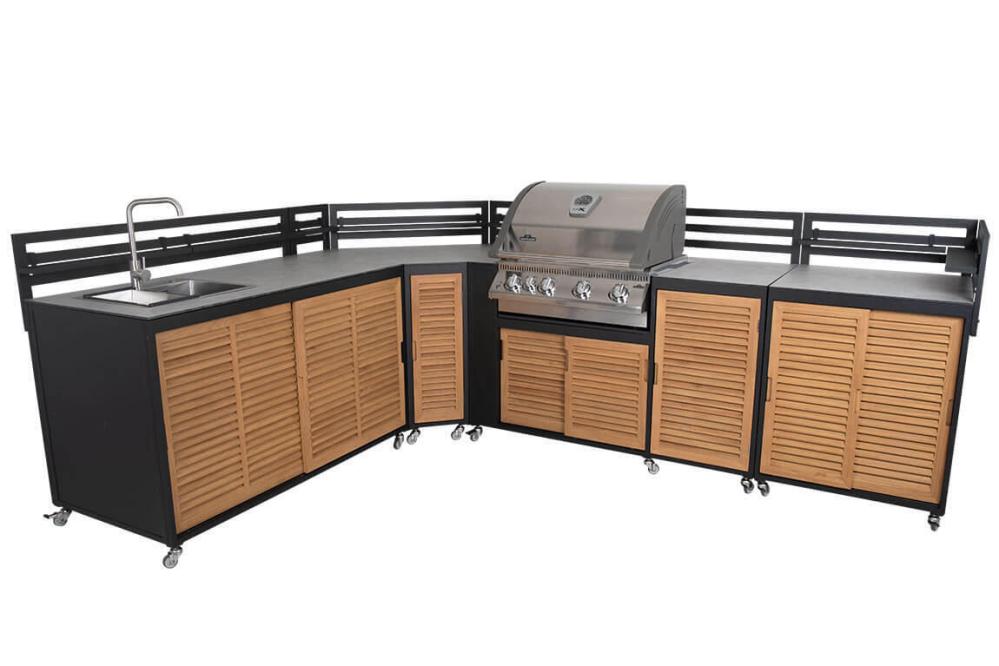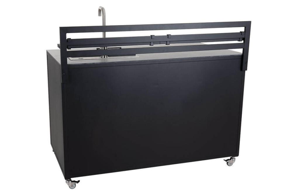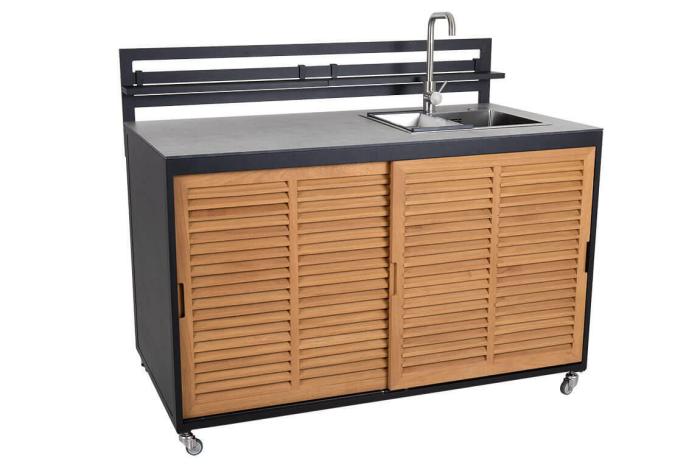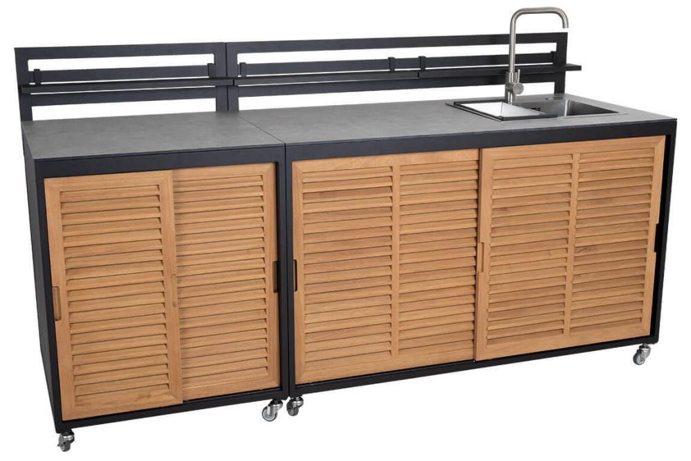 En enhet är förberedd för att lägga till en gasolgrill (OBS! köps separat), en enhet har diskho och vattenkran och en annan enhet har en slät topp, perfekt som arbetsyta. Alla enheter har rejäla hjul, bakdel/staket och hylla. Som tillbehör finns också en skiva (stor och liten) som kan monteras för att skapa en bardisk.
