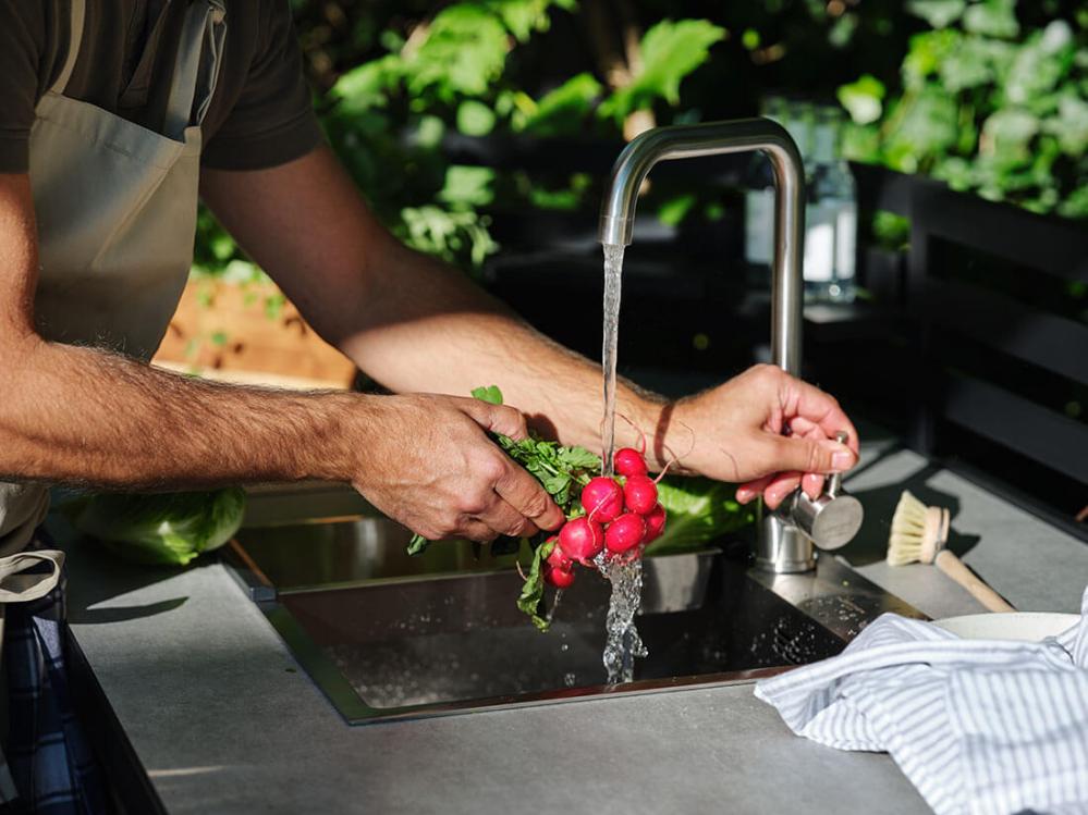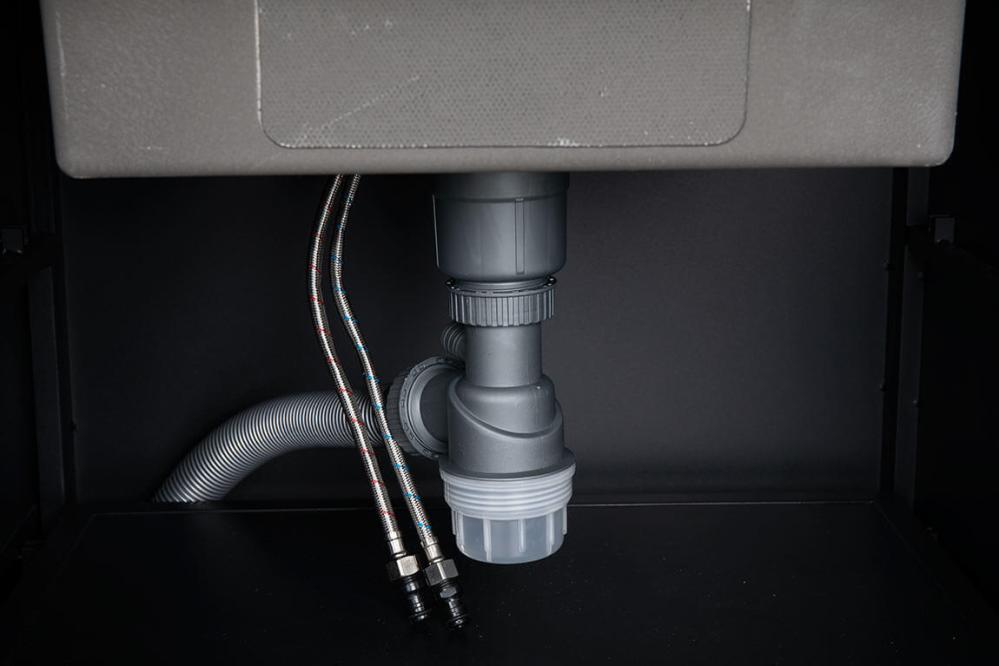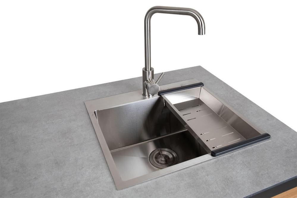 Fornax köksdel med vask och kran levereras med en bakdel/staket och två hyllor som kan bytas ut mot separat skiva för att skapa en bardisk eller extra avställningsyta (separat skiva köps som tillval).
