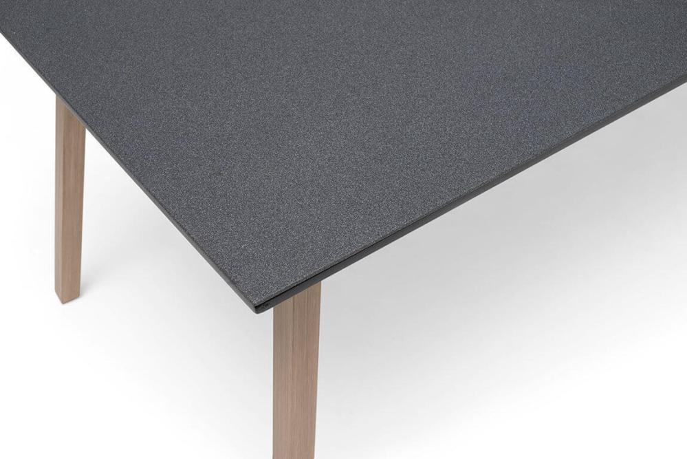 Matbordet har en toppskiva av grå/svart glas med naturfärgade aluminiumben. Bordet sammansluter hela serien på ett fint sätt.