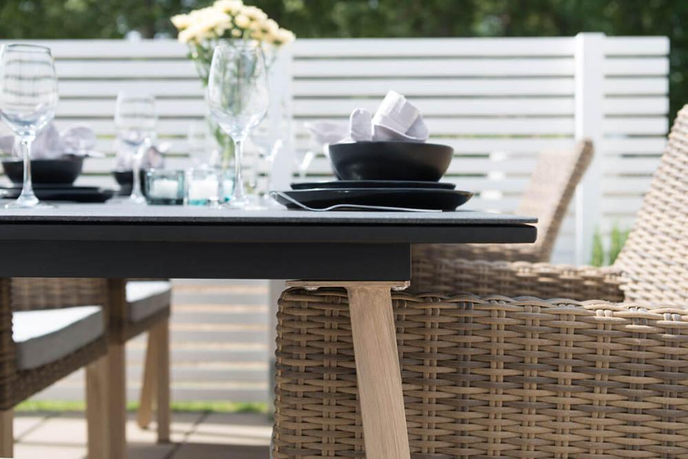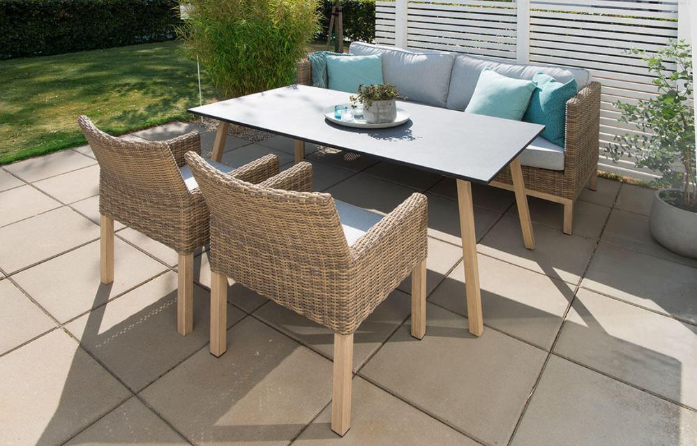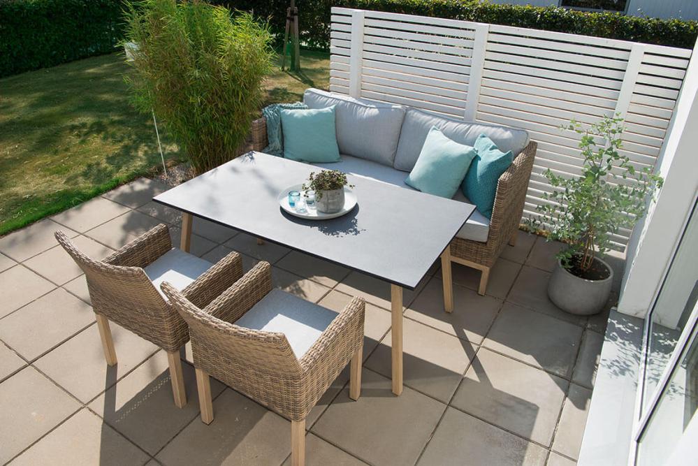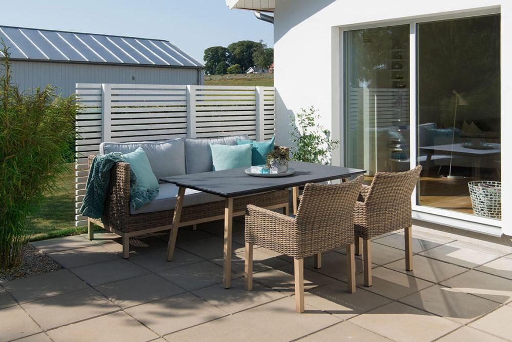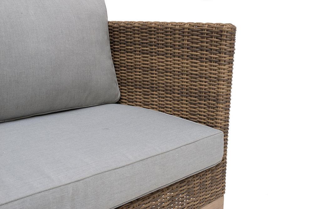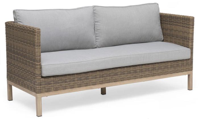 Soffan i naturfärgad konstrotting på aluminiumstomme ger gott om plats för många samtidigt som den är skön att sitta i. Ljusbeiga dynor ingår.