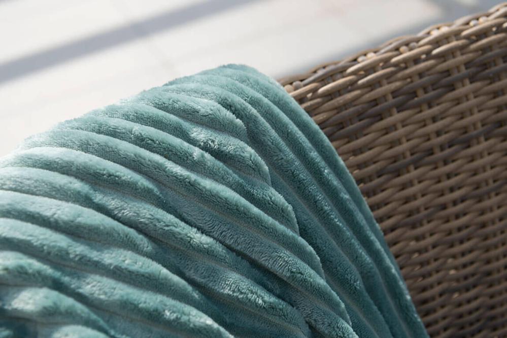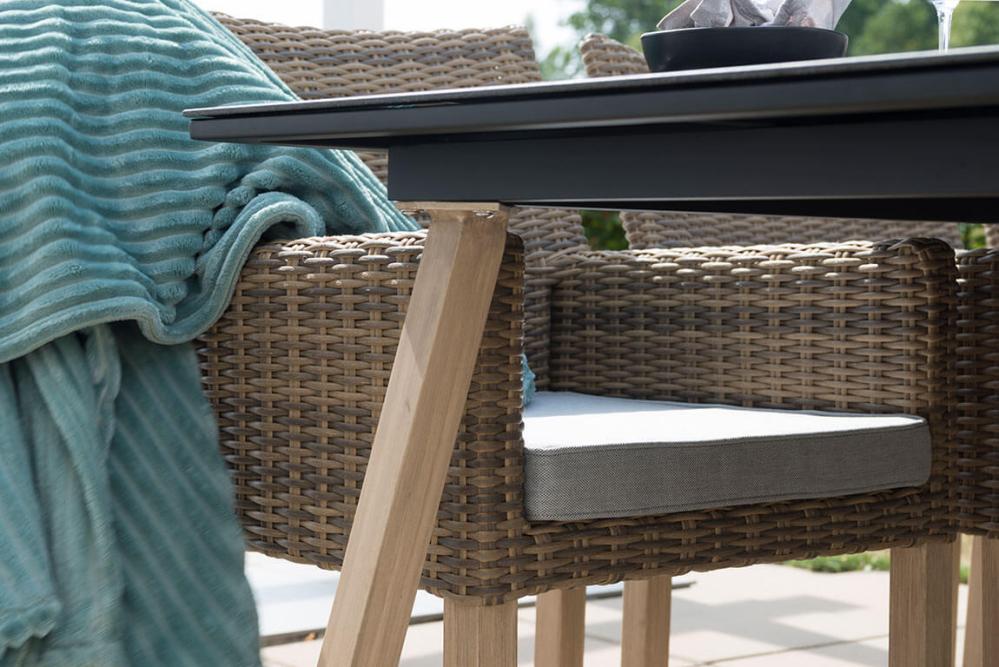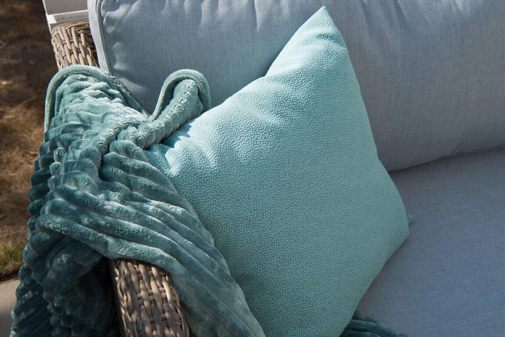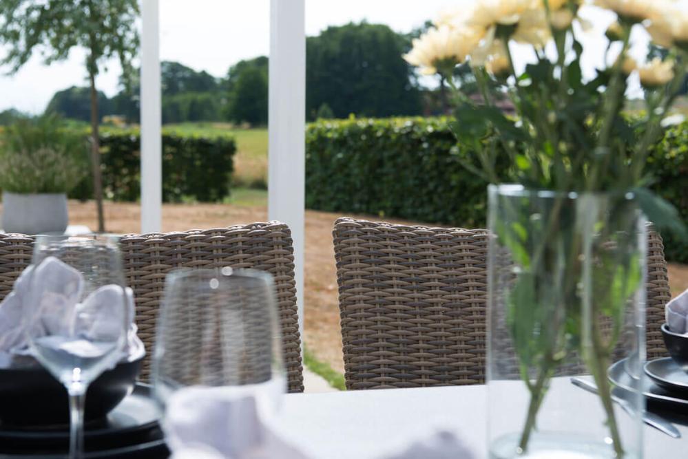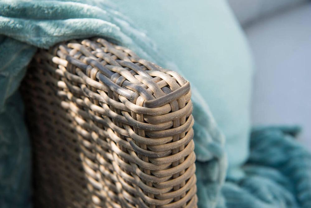 Soffan i naturfärgad konstrotting på aluminiumstomme ger gott om plats för många samtidigt som den är skön att sitta i. Ljusbeiga dynor ingår.