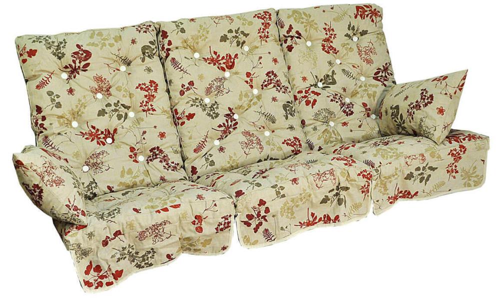 Högt hammockset innehållande tre hammockdynor och två sidokuddar. Boxsydda med baksida i PVC, sydd med kederlist. Mellan sits och rygg sitter två par snören som gör det möjligt att knyta fast dynan i hammocken. Måtten i produktinformationen är per dyna.