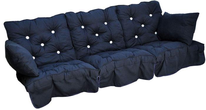 Tjockt hammockset innehållande tre hammockdynor och två sidokuddar. Boxsydda med baksida i PVC, sydd med kederlist. Mellan sits och rygg sitter två par snören som gör det möjligt att knyta fast dynan i hammocken. Måtten i produktinformationen är per dyna.