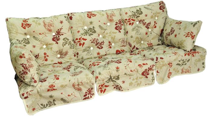 Tjockt hammockset innehållande tre hammockdynor och två sidokuddar. Boxsydda med baksida i PVC, sydd med kederlist. Mellan sits och rygg sitter två par snören som gör det möjligt att knyta fast dynan i hammocken. Måtten i produktinformationen är per dyna.