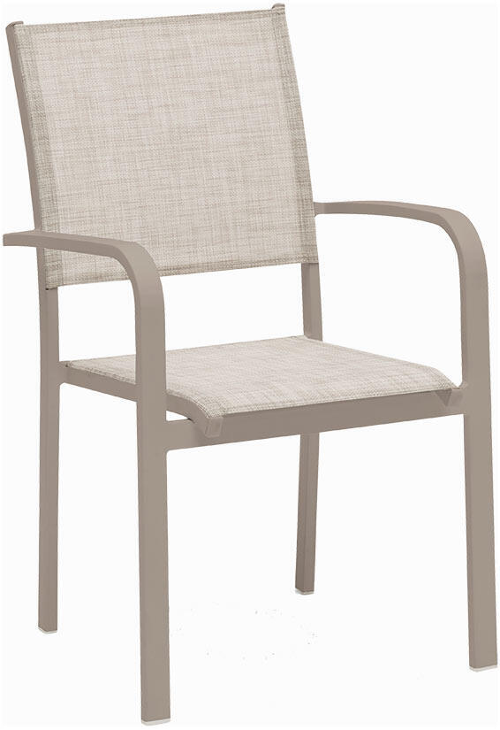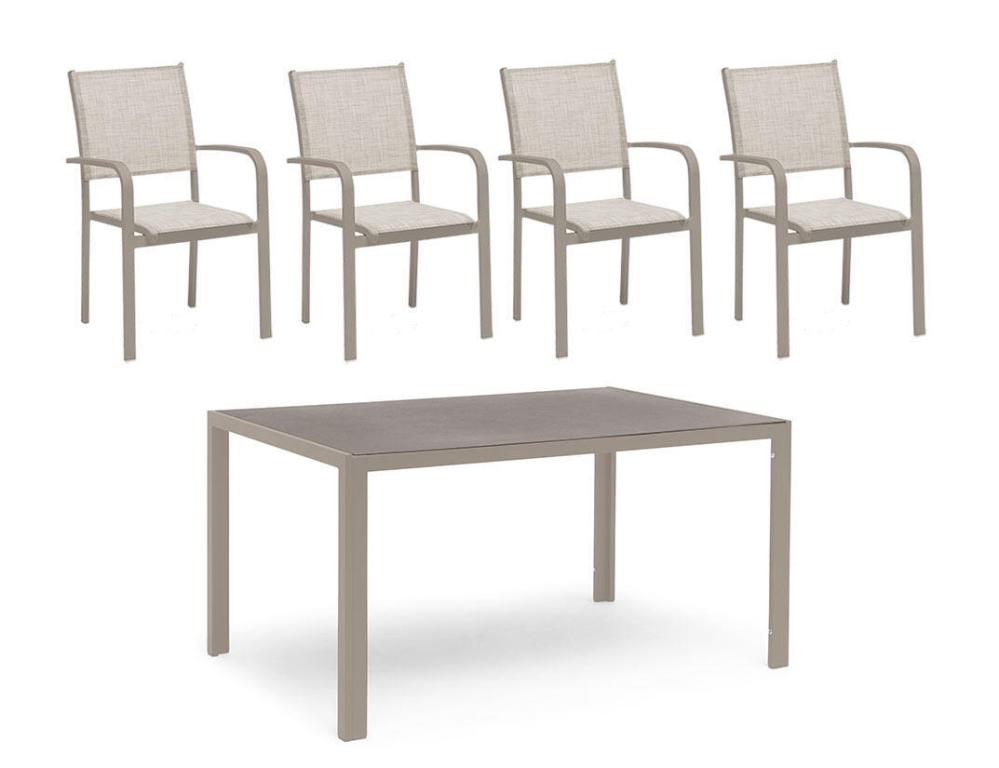 Bordet såväl som stolarna har en bas av underhållsfri sandfärgad aluminium. Bordsskiva i varmgrå melerad keramiskt glas, 8 mm tjock. Bordet är lättskött precis som de bekväma stolarna med beige textilene.