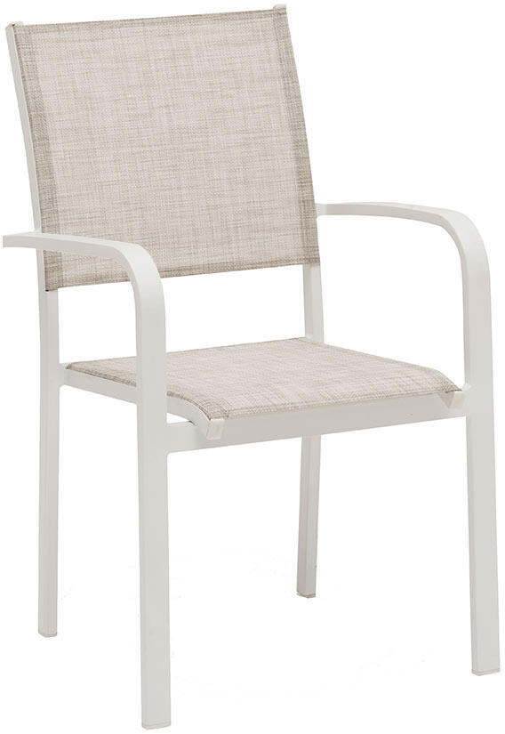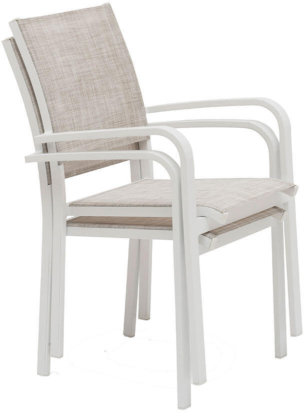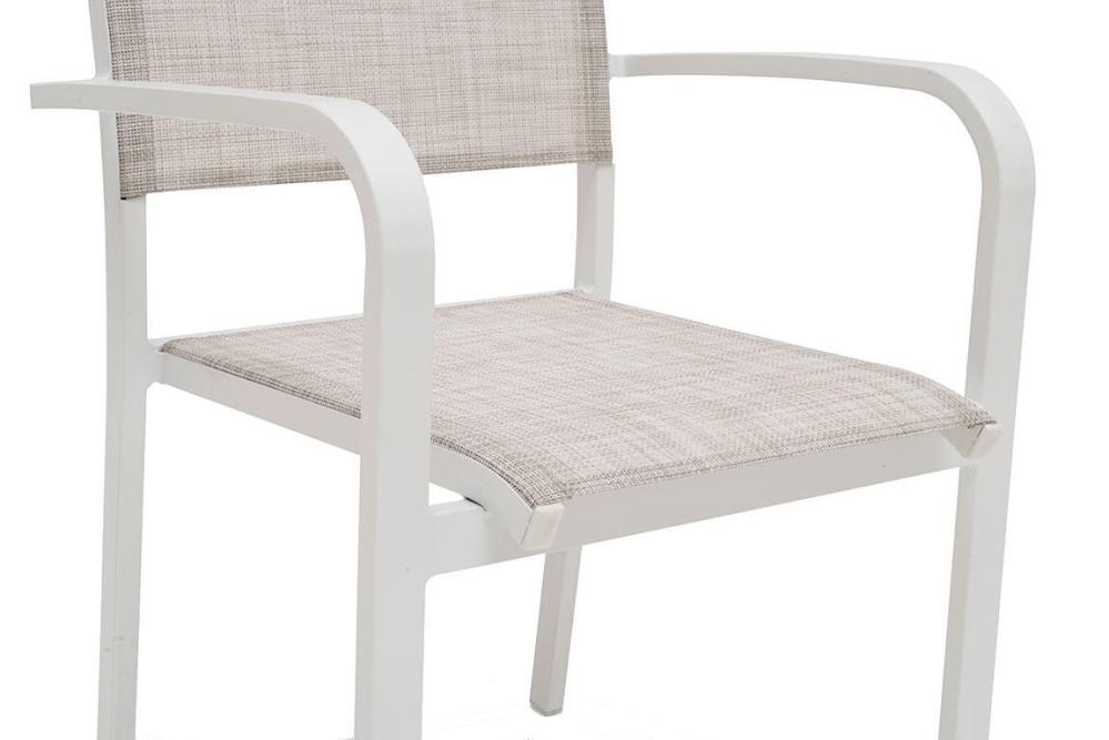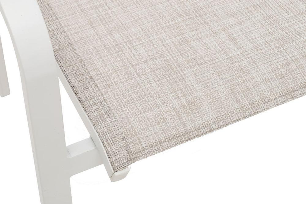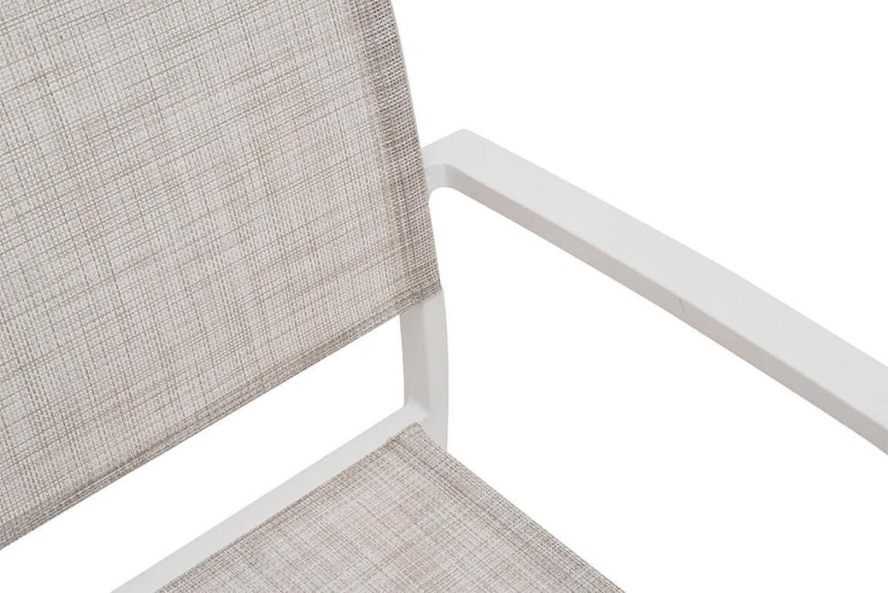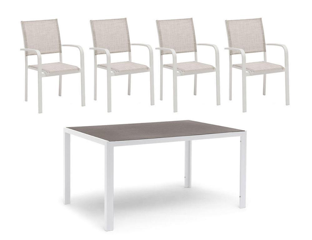 Bordet såväl som stolarna har en bas av underhållsfri vit aluminium. Bordsskiva i varmgrå melerad keramiskt glas, 8 mm tjock. Bordet är lättskött precis som de bekväma stolarna med gråbeige textilene.