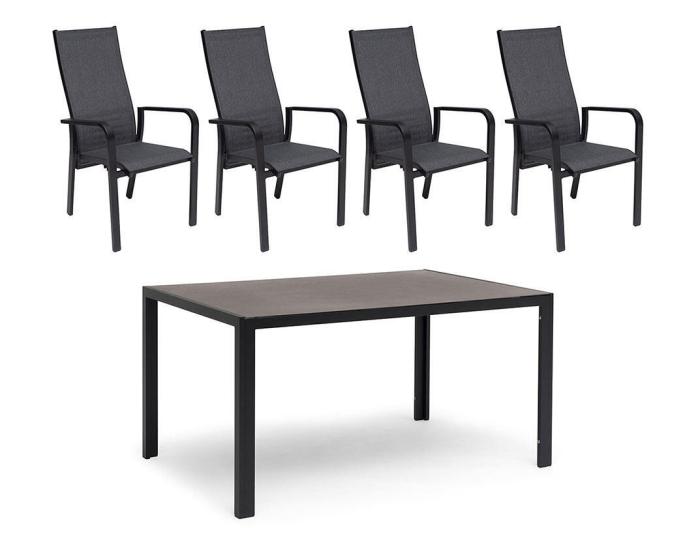 Bordet såväl som stolarna har en bas av underhållsfri svart aluminium. Bordsskiva i varmgrå melerad keramiskt glas, 8 mm tjock. Bordet är lättskött precis som de bekväma stolarna med grå textilene.