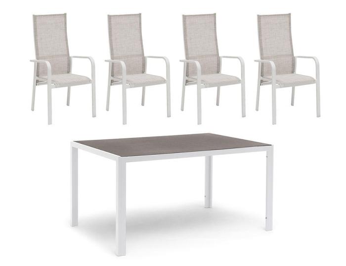 Bordet såväl som stolarna har en bas av underhållsfri vit aluminium. Bordsskiva i varmgrå melerad keramiskt glas, 8 mm tjock. Bordet är lättskött precis som de bekväma stolarna med gråbeige textilene.