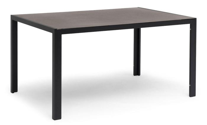 Hånger matbord från Hillerstorp, i underhållsfri svart aluminium med en bordsskiva i varmgrå melerad keramiskt glas, 8 mm tjock. Bordet finns i storlekarna 140x90 och 210x90 cm.