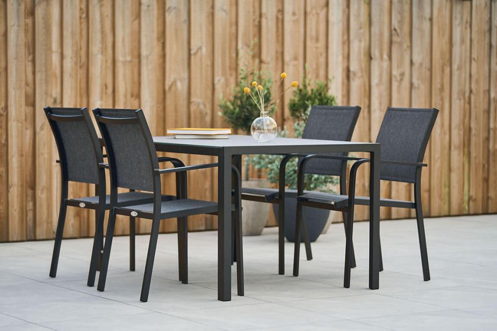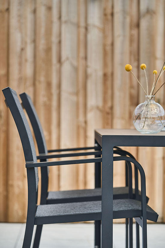 Skapa en fin helhet i trädgården, på altanen eller i uterummet med Hånger. En stilren och lättskött möbelserie i sand, svart eller vit aluminium med detaljer i textilene och bordsskiva av Gaumo™ eller varmgrå keramiskt glas. Hånger finns både som mat- och loungemöbler.
