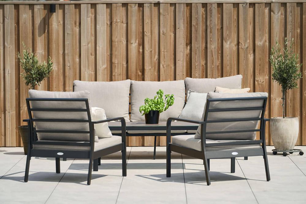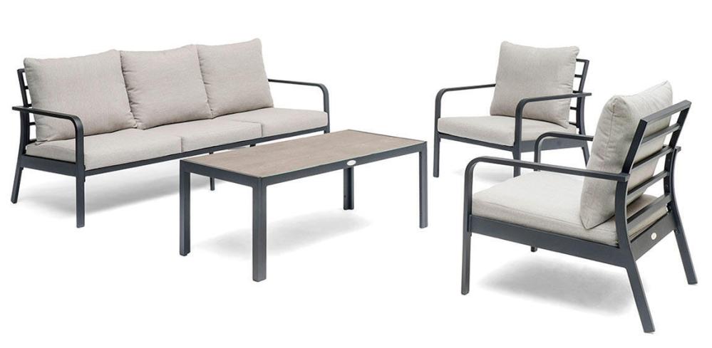 Hånger här som generös soffgrupp som med sin lätthet i designen ger ett stilrent och modernt uttryck. Tillverkad i aluminium med dynor i gråbeige olefin.