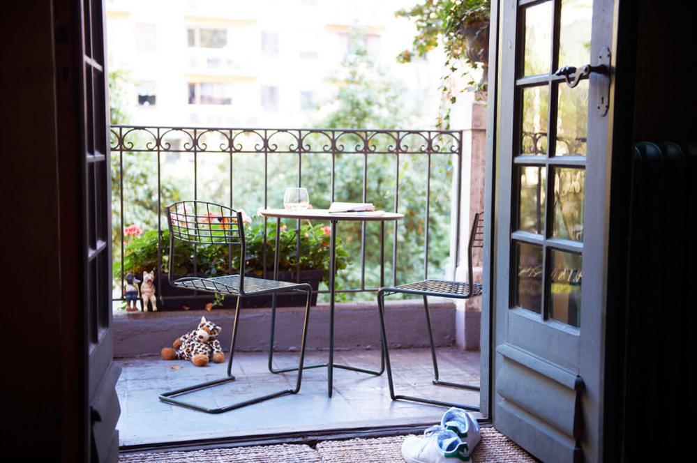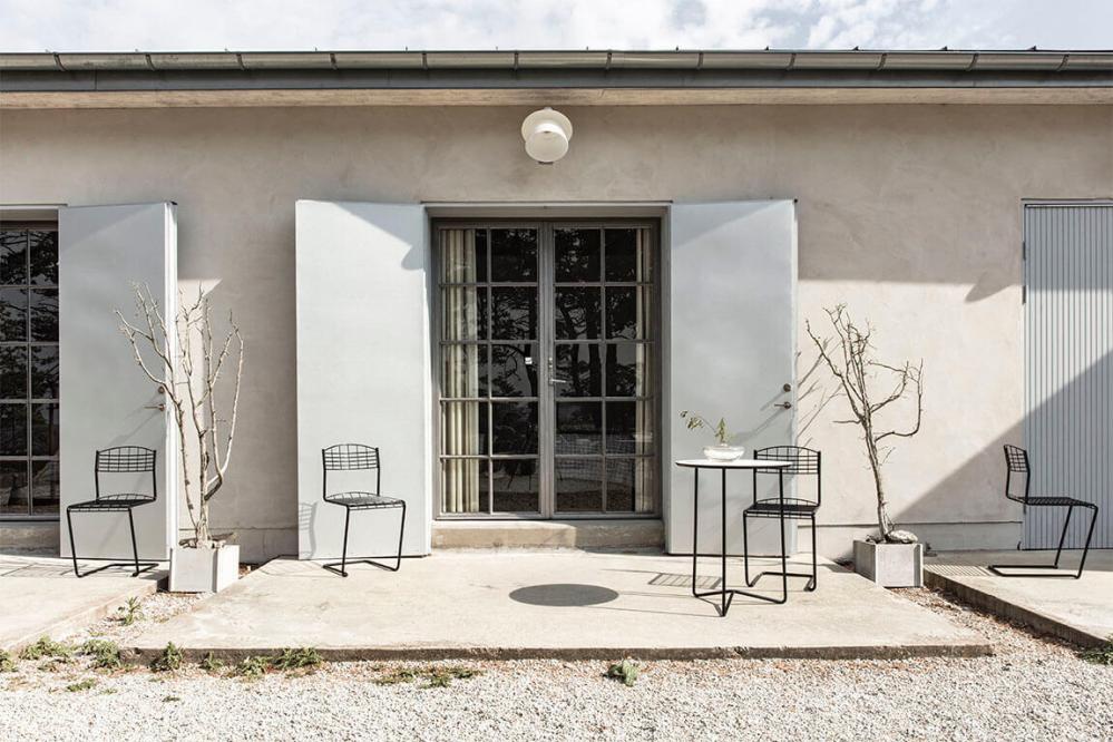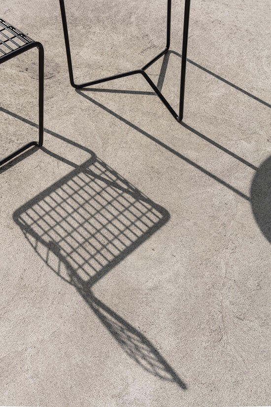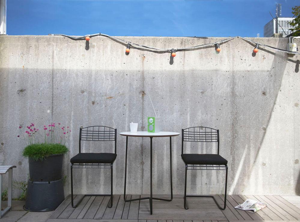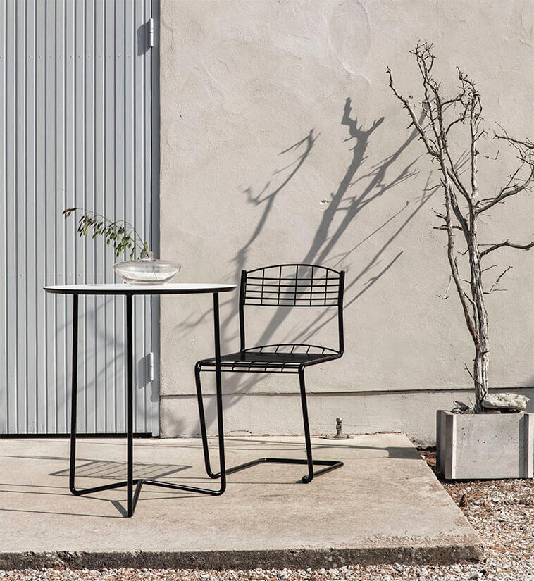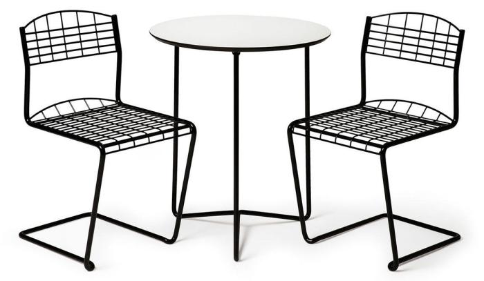 Trädgårdsgrupp bestående av High Tech Bord Ø60 cm tillsammans med två stycken stolar från Grythyttan Stålmöbler är en nätt och lättplacerad cafégrupp.