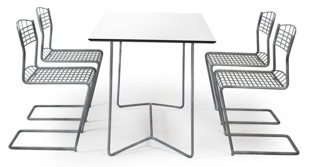 High Tech bordet med måtten 110x70 cm är ett lättplacerat bord som passar lika bra på en uteplats som inomhus. Bordet är framtaget till Nisse Strinnings klassiker High Tech Stol. Bordets design är lätt och stabil, givetvis med Grythyttans höga kvalitet i material till minsta detalj i tillverkningen. Bordet är gjort av fjäderstål med vit tålig laminatskiva och antingen svart eller varmförzinkat stativ. I varmförzinkat utförande kan det stå ute året runt. För smidig förvaring är bordets stativ avtagbart.