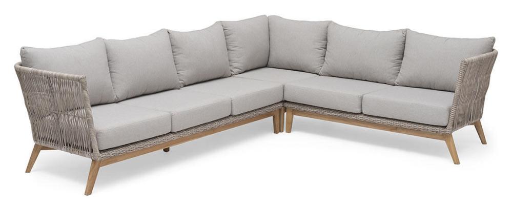 Himmelsnäs hörnsoffa ger rymlig plats för flera att koppla av en skön sommardag. Soffan har en stomme av aluminium med beigefärgade Quató™ konstrottingband som formar en skön sits samtidigt som det är stilrent. Underredet i teak och tjocka dynor i beige sunproof gör möbeln komplett. Sunproof är ett väderbeständigt och UV-resistent premiumtyg av 100% olefin. Klädseln är dessutom avtagbar och kan handtvättas. Hörnsoffan består av en 3-sitsmodul, en 2-sitsmodul och en hörndel, vilka är enkla att koppla samman.