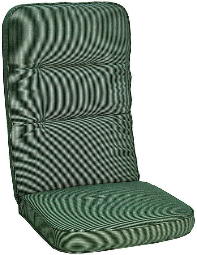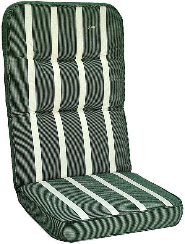 Home är en 10 cm tjock boxsydd Högvikdyna i dralon. Dynan är vändbar med två olika mönster, bredrandig på ena sidan och smalrandig på den andra. Den här modellen är i färg Classic Grön.