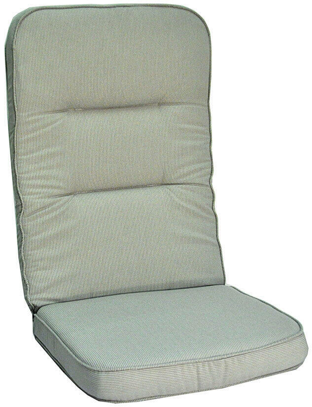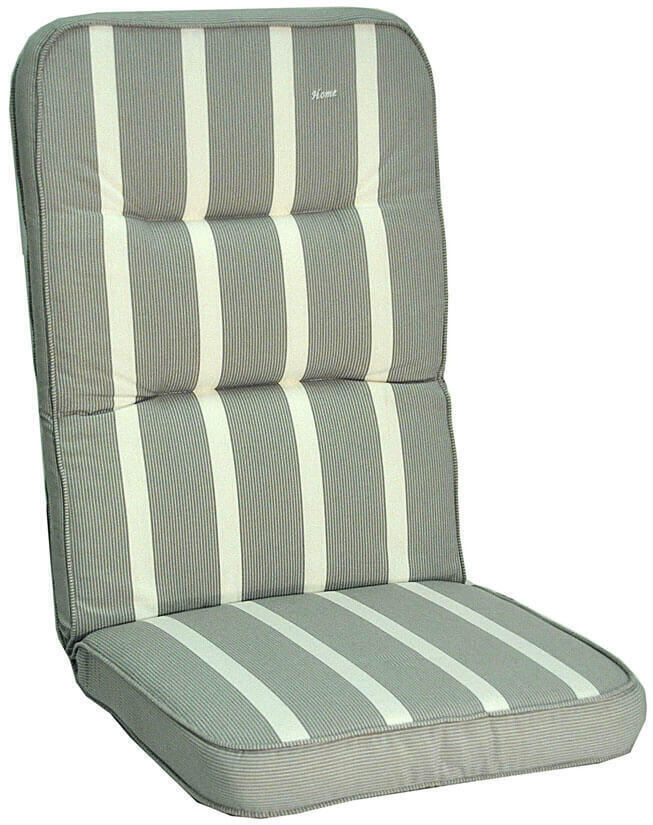 Home är en 10 cm tjock boxsydd Högvikdyna i dralon. Dynan är vändbar med två olika mönster, bredrandig på ena sidan och smalrandig på den andra. Den här modellen är i färg Classic Ljusgrå.
