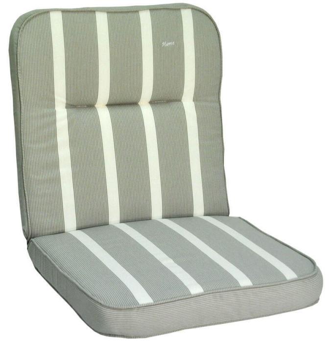 Home är en 10 cm tjock boxsydd Lågvikdyna i dralon. Dynan är vändbar med två olika mönster, bredrandig på ena sidan och smalrandig på den andra. Den här modellen är i färg Classic Ljusgrå.