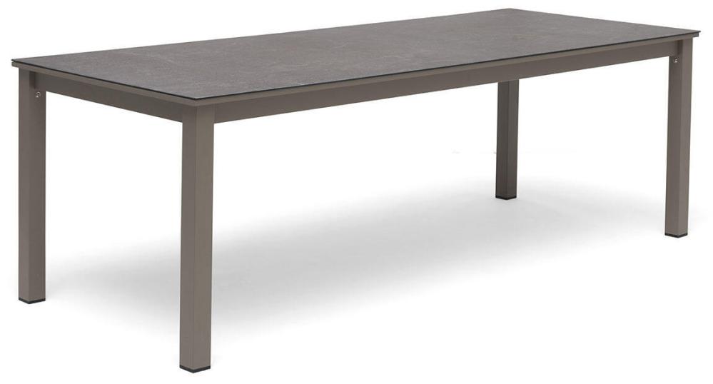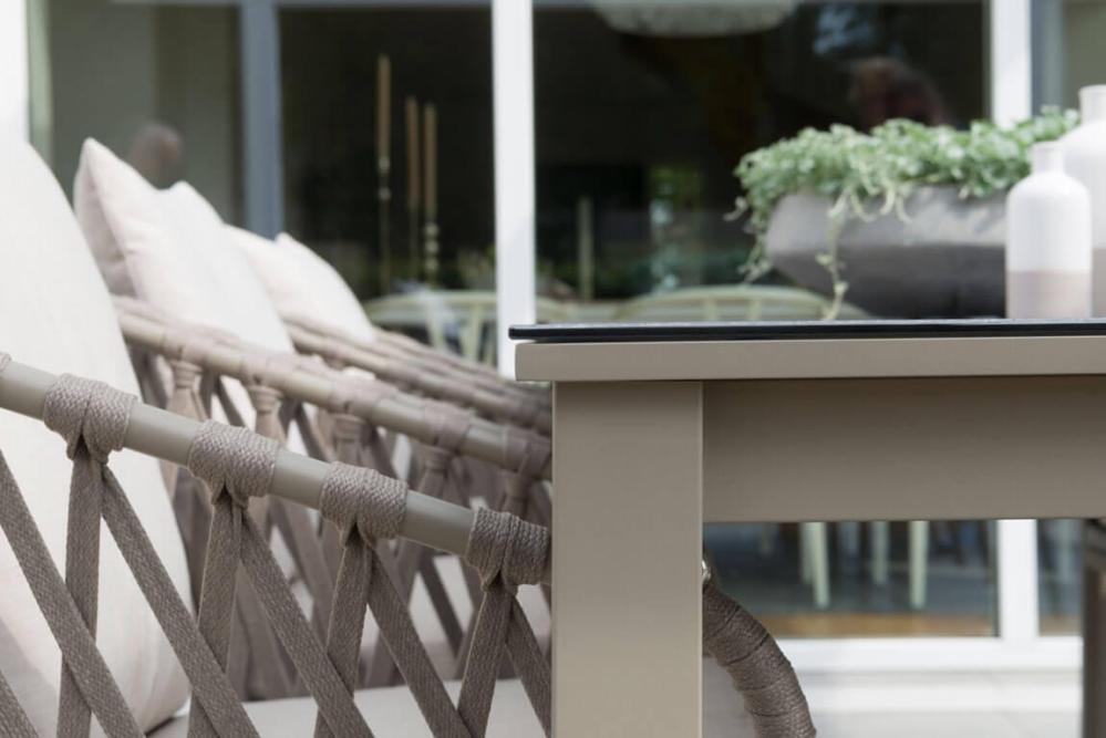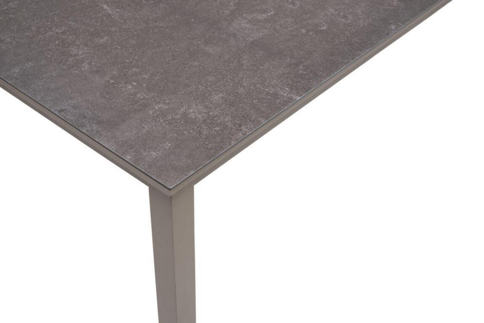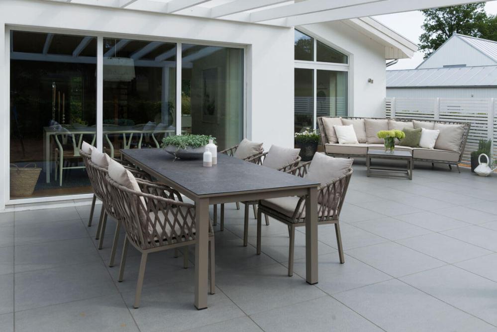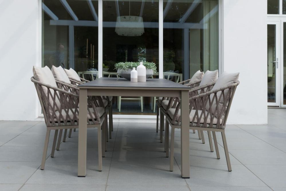 Matgruppen Jet Set med sex stycken obeskrivligt bekväma matstolar tillverkade av exklusiva konstrottingband och sköna sitt- och ryggdynor samt det eleganta och stora bordet på 220x90 cm utgör en rejäl trädgårdsgrupp. Matbordets stomme består av beigelackad aluminium och bordsskiva i tåligt grått keramiskt glas.