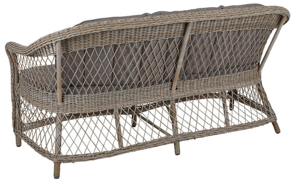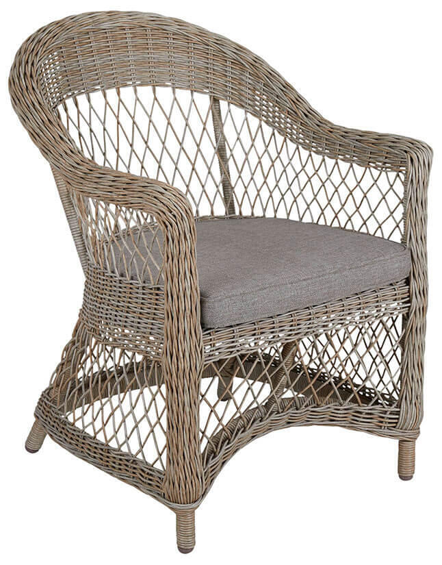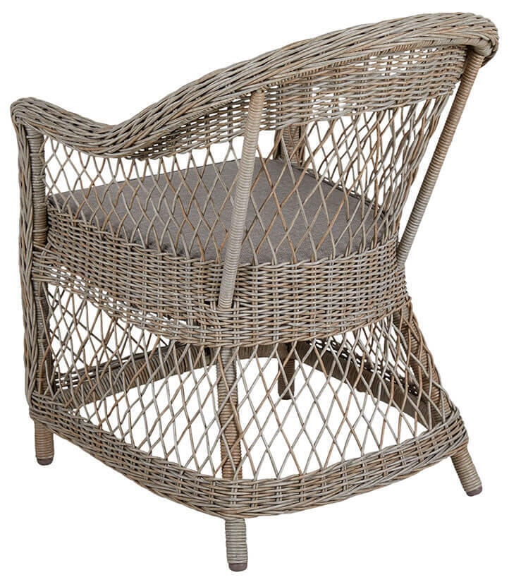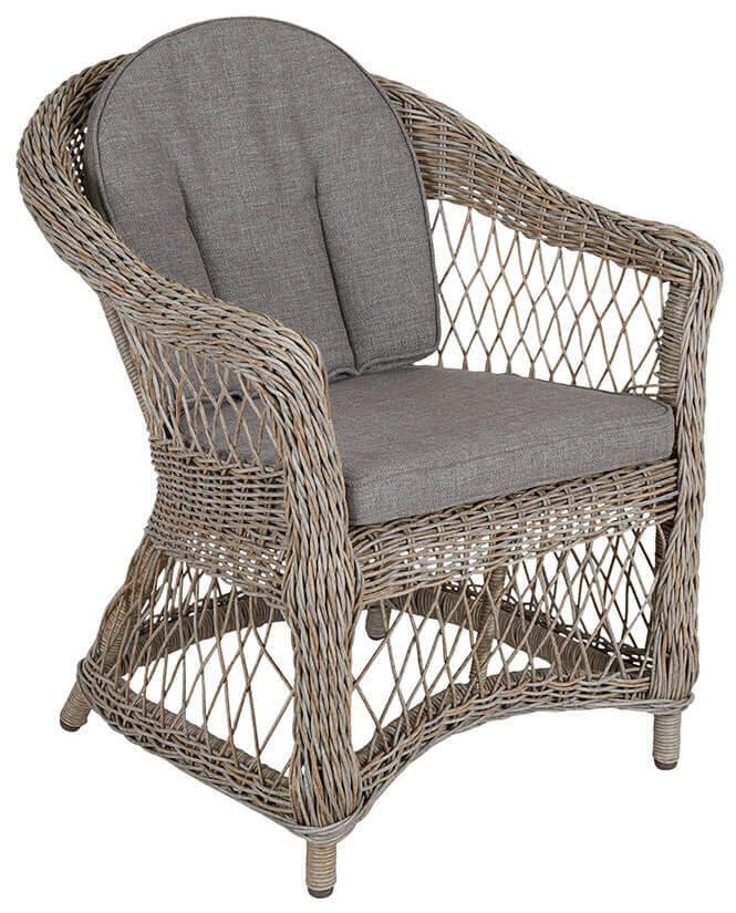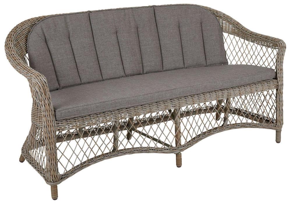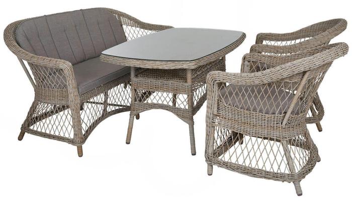 Alla delar i gruppen har en bas av beige konstrotting. Matbordet har en praktisk skiva av härdat glas, till soffan ingår både sittdyna och ryggdynor i beige olefintyg och till fåtöljerna ingår sittdynor. Fåtöljerna kan kompletteras med ryggdynor för extra hög komfort.