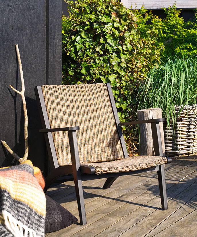 Kira fåtölj är resultatet av skickligt hantverk. Designen är klassisk och har förfinats under många år. Skön att koppla av i. Kira finns med stomme antingen i aluminium eller teak och med sittdel i vävd rustik eller grå konstrotting. Den här modellen är i svart aluminium med rustik konstrotting.