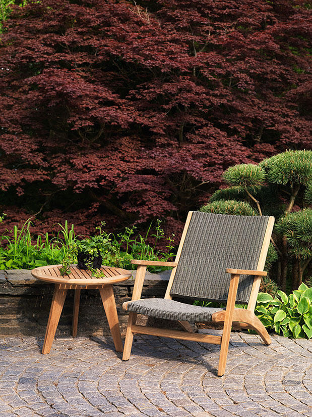 Kira relaxfåtölj är resultatet av skickligt hantverk. Designen är klassisk och har förfinats under många år. Skön att koppla av i. Kira finns med stomme antingen i aluminium eller teak och med sittdel i vävd rustik eller grå konstrotting. Den här modellen är i teak med grå konstrotting.