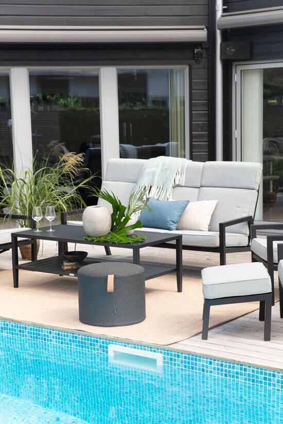 Med Kotte sittpuff kan du skapa spontana sittplatser precis där de behövs. Utomhuspuffen fungerar också som ett riktigt snyggt fotstöd till din trädgårdsfåtölj eller utesoffa. Puffens handtag gör den lätt att flytta och placera där du behöver en extra sittplats. Kotte innehåller allvädersskum och är klädd med olefintyg vilket gör att den klarar av klassiskt svenskt sommarväder.